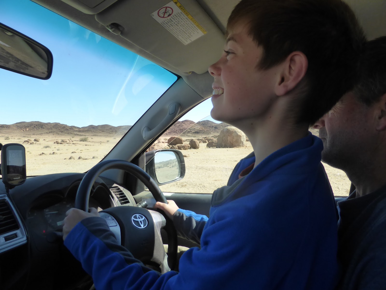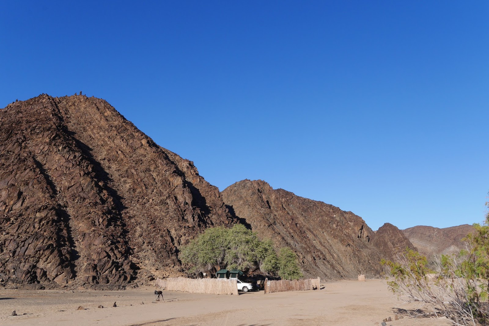 There was a Land Rover approaching in the distance. We stopped and they stopped and we compared notes. They were a cheery young German couple who’d been climbing in Spitzkoppe and were thinking about doing our route in reverse. I told them if they could get past the steep, wet bit of track beyond the Rhino Camp they would be OK for the rest of the route, but going uphill there would be a lot harder than coming down it like we did. We compared maps and they told us that the road ahead was very badly corrugated. It was nice chatting to kindred spirits in this empty landscape but eventually we bid our farewells, started the engines and went our separate ways.