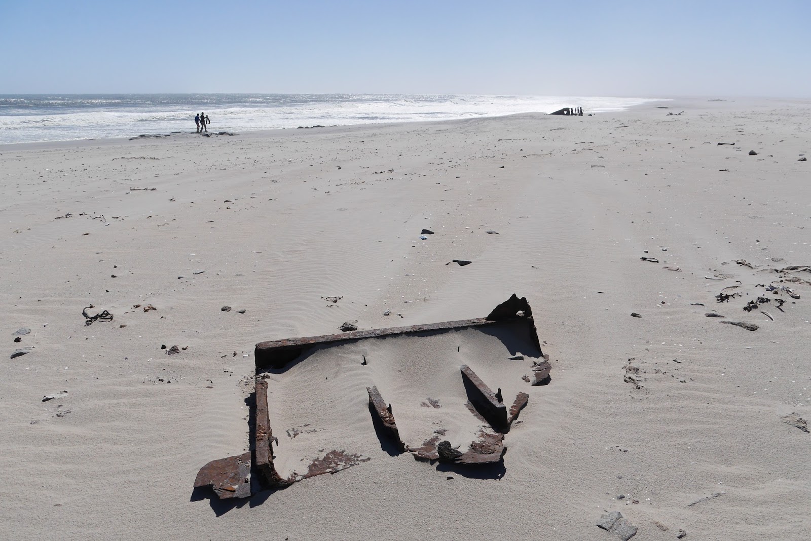 We needed to go south but wanted to see a shipwreck marked on the map and drove north for half an hour on an eerily smooth salt road that bobbed over the dunes. We turned left at the point marked on the satnav, but the sand had obscured any trace of a track so we made our own – the four wheel drive struggling to pull us through the deep sand. After a couple of K we stopped on a hard bit of beach (so I could turn around) and got out.