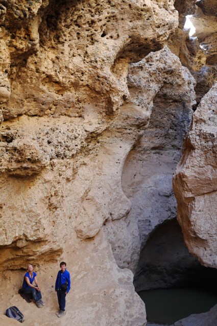 Sesriem, back towards the coast, was only a short drive away. Its a jumping off point for the most famous dunes in Namibia; the vast orange ones that appear on the front pages of the guidebooks. They are some of the largest in the world and mostly impenetrable. But from Sesriem there is a 60K corridor between the dunes. It follows the line of a river which has kept the dunes at bay – and they do move around. Some of these thousand foot giants travel a hundred and fifty feet a year. The journey out to the big dunes was for tomorrow though. Our first stop in Sesriem was the canyon carved by the Tsauchab river fifteen million years ago. From ground level it appears as a fairly innocuous slit in the desert floor, but when you climb down into it, it is a twisting, tortuous, narrow canyon. It doesn’t look like it was formed gently by a meandering river over thousands of years. Rather it appears to have been blasted into existence by a sudden event which shifted huge rocks around and formed big caves all at once. We followed it upstream as far as we could until it ended in a jumble of giant boulders and a small pool of cold water.