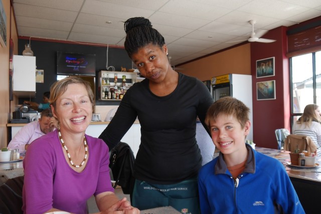 We scouted out a cafe on the waterfront and were met by a young waitress with a sparkle in her eye and a world-weary air. Her name was Amante; “Born in Luderitz, went to school here; I have a three year old son. Probably be a grandmother here” That last bit said with a wry laugh. She brought us pizza, amused by P not eating meat. “Here’s one for the vegetable”. Then coffee and what might just be the best apple cake we’ve had in Namibia. It was a jolly lunch and Amante kept coming back to chat. She couldn’t wait for her busy three year old to go to school and was intrigued by what Tom was up to. She was one of those people who in a different setting could have been anything she wanted. We said our goodbyes and had a quick look at the waterfront before heading back to the car.