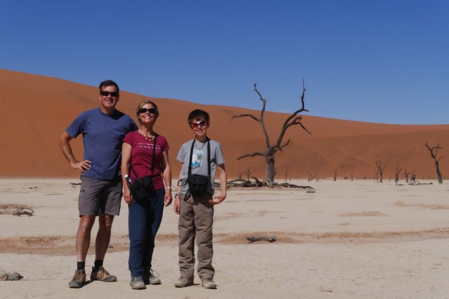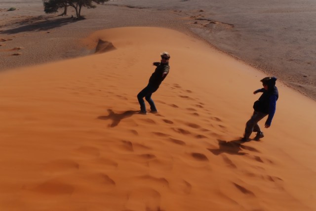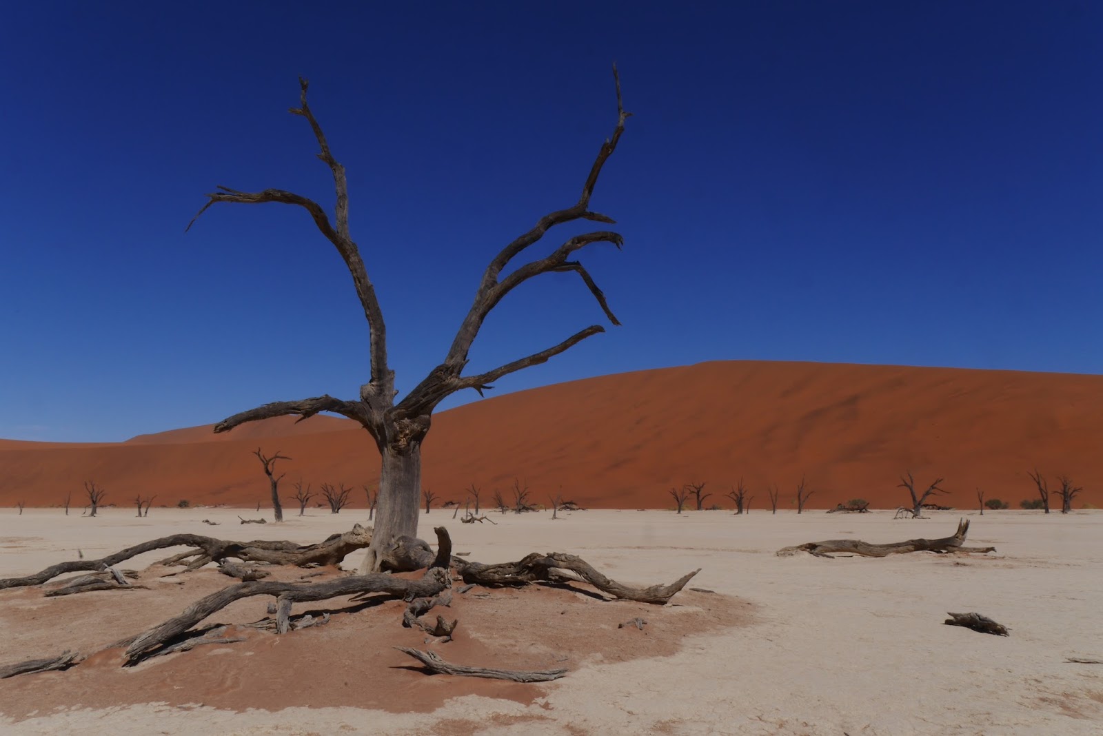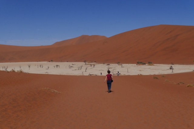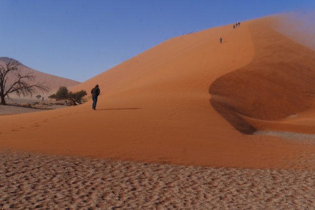 Getting down was much easier. We just jumped over the side and ran. No dune is steeper than 35 degrees (we learned in Swakopmund) so they will always catch you if you fall. In the lee of the dune it was still and hot and we stopped for trail mix and water. A young couple were looking up rather dubiously at where we had come from, and asked how long it had taken. We told them it wasn’t as terrifying as it looked and they set off for the top.We walked on to Dead Vlei, an ancient lake bed which stopped filling in the rains causing all the trees in it to die.