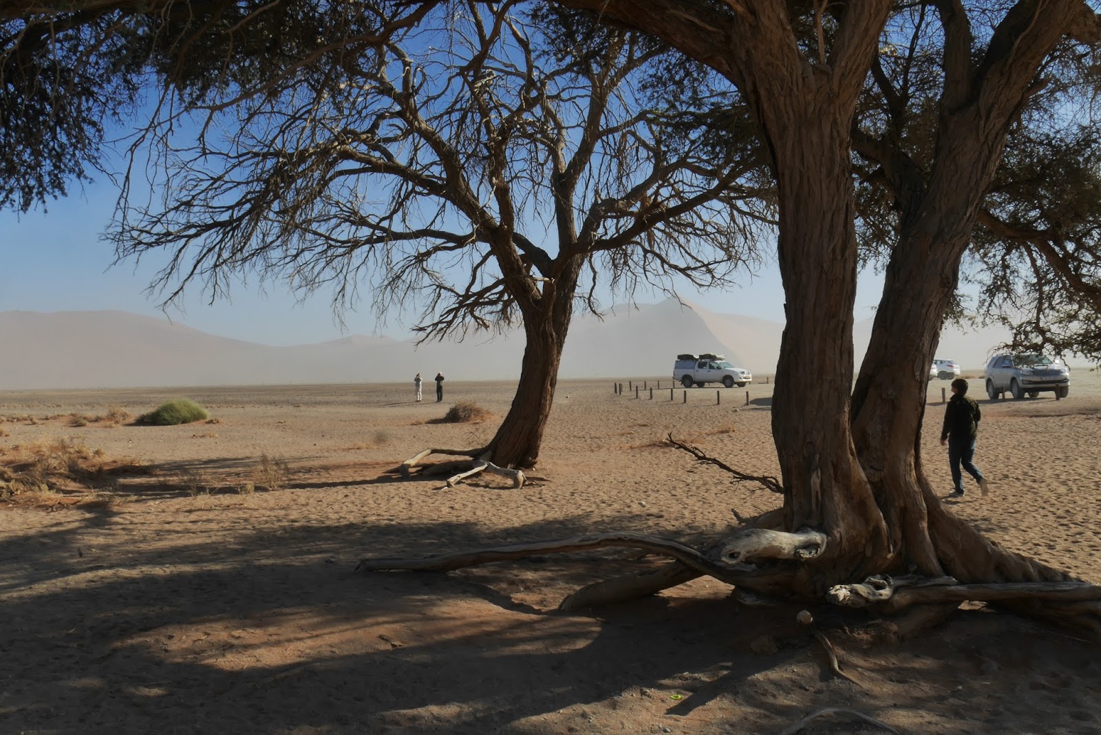 Back to Mrs Woolly hat for another formal exchange. Then we were off, with the big dunes shadowing the road at a distance; red in the early morning. There was so much sand and dust in the air that it felt like we were driving into a fine mist.