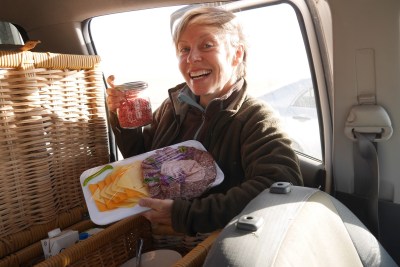 We’d arranged for the lodge to give us a breakfast to take with us to the dunes. P and T went to collect it and appeared looking giddily excited with one of the staff carrying the most enormous hamper. In it were two kinds of yoghurt, a cheese and meat platter, cereals, milk, coffee, bread, various jams, cherry juice, apples and oranges as wells as china and cutlery, glasses, napkins and a tablecloth.