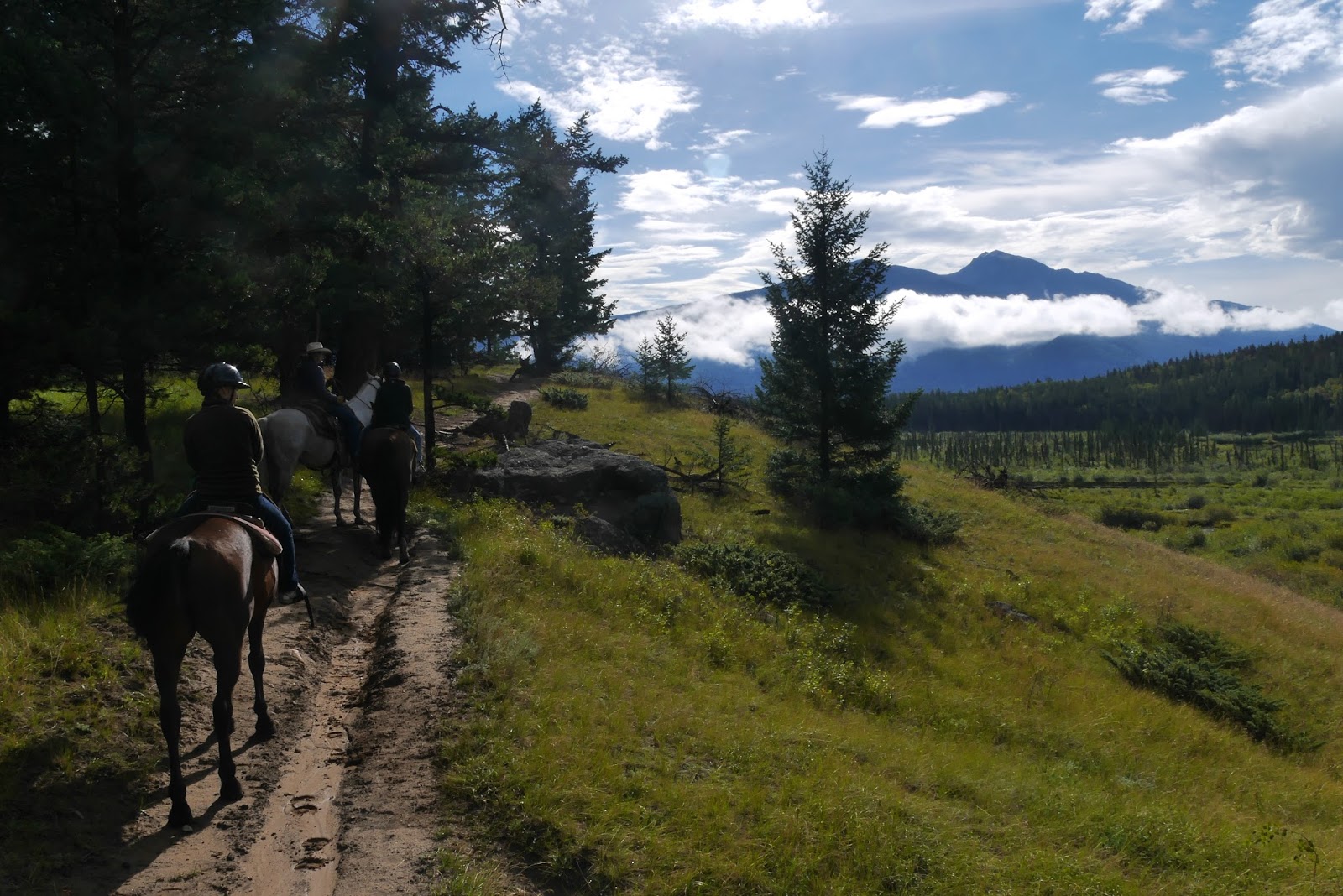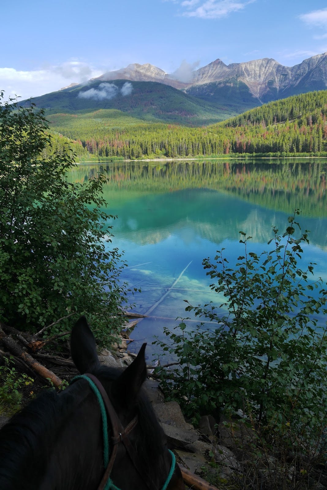 We assumed we would stay together but we rode with them for about two minutes before Sarah decided to lead us up a different part of the mountain. And not without some drama. Her horse suddenly reared not once, but three times and she struggled to get it back under control. It left our mounts a bit spooked and Sarah was clearly unnerved, saying that had never happened to her before. Once things had settled down we carried on up the trail and to be honest it was good to finally get out of the woods and onto a rocky ridge with a fine view over to Jasper.