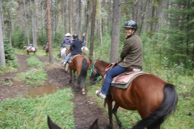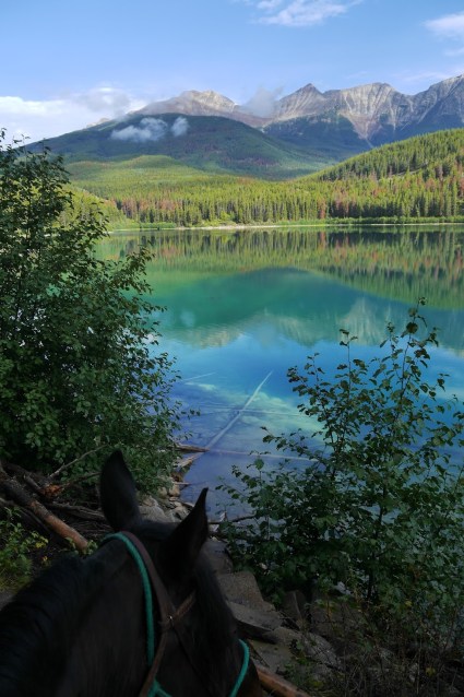 We were up early for an appointment with a horse. Three horses in fact who, even now, were having their breakfasts unaware that we were coming to sit on them. We’d booked a morning ride some months ago and arrived at the Jasper Riding Centre before nine for a three hour ride into the hills.