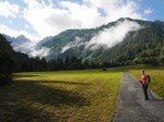 The route follows along the Val Veni climbing and dipping through green meadows which are now full of butterflies. Every so often we walk through small clouds of them at our feet. The southeastern slope of Mont Blanc faces us across the valley, lofty and silent. It is a beautiful walk with the peaks lining the valley like soldiers.
