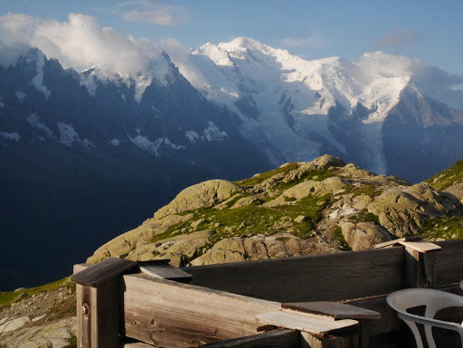 The first was at a cable car station a couple of hours away. We sat with coffee in the sunshine as fresh faced hikers arrived by the cable-car load ready for a day in the mountains. There were wannabe rock climbers with helmets and a guide – and walking boots – which suggested they were going to be clipped to a safety line somewhere and taken up a tourist thrill route. They had group photos taken with Mont Blanc over their shoulders; thumbs up and much back-slapping bravado. The actual mountaineers arrived too, lean and wiry, with slim fitting climbing shoes and coiled ropes in garish colours. We were still a long way from finishing but we were no longer in the remote mountains.