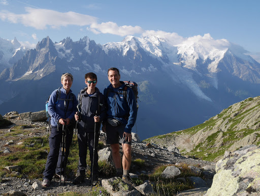 The rain was still pouring when we got to Chamonix and walked through mostly empty streets to our hotel. Tom was ready to sleep but the friendly young woman at reception suggested a cosy Italian restaurant in an old stone basement five minutes away which seemed like a good idea. Pausing only to dump our packs we went straight there and sat in our damp, muddy hiking gear toasting our success. Tom, who never missed a beat on this whole trip, never complained when it was hard, and always maintained his enthusiasm, had a garish mocktail His parents had “Mont Blanc blonde”. It seemed appropriate.