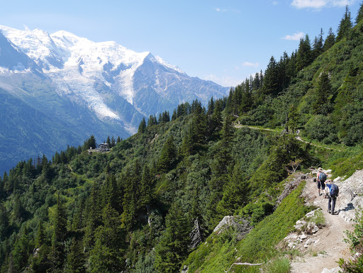 The next bit of the track was a long, level walk along a steep mountain-side in hot sunshine. The trail was busy with people walking back down to Chamonix below us; summer holiday shorts out for the first time and white calves that were going to be pink in an hour or so.