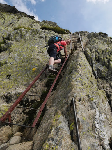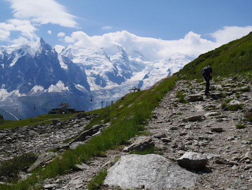 Climbing the rocky col behind the restaurant was hard work with a belly full of lunch, but soon the ski station was just a little square of building far below us. The sky was on the turn though, with grey clouds rolling in. We met three young English women coming down. They said they’d been told the big cable car at the summit was closing because of a storm and they’d decided to turn back. Our only alternative option was a long, steep switch-back path down to Chamonix. We were halfway up the col and decided to press on. If we got wet, we got wet.