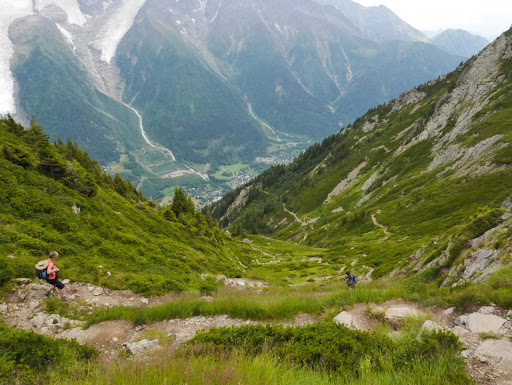 Once again there were crowds of people coming off the cable car for their taste of the mountains. The cable car was also our escape route if we wanted it; a chance to avoid what the guide calls one of the hardest continuous downhill sections of the whole route: three hours of steep descent into Les Houches where our journey began. It was tempting, given that it was now four o’clock and we still had 8K to cover. But we’d always said that if our knees were up to it, we should complete the circle around Mont Blanc. So down we went.