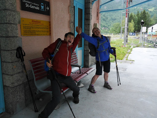 We were almost too tired for euphoria and we still had to get to our hotel in Chamonix. I rang a number on the notice board which promised taxis and “English spoken”. Neither were offer though. “Desolet” said the lady at the other end. So we waited for the train, watching the rain fall and finishing the trail mix.