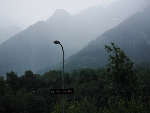 The path left the road and cut through the woods where the rain was kept at bay by the foliage overhead. Thunder rolled around above us and a church bell rang. There were signs for the railway station at Les Houches and we crossed and recrossed the road down the mountain, passing slate-roofed wooden houses dripping in the rain, and a giant statue of Christ looking down the valley. The sky was getting ever darker and the rain was falling in rods when we popped out onto the road for the last time.