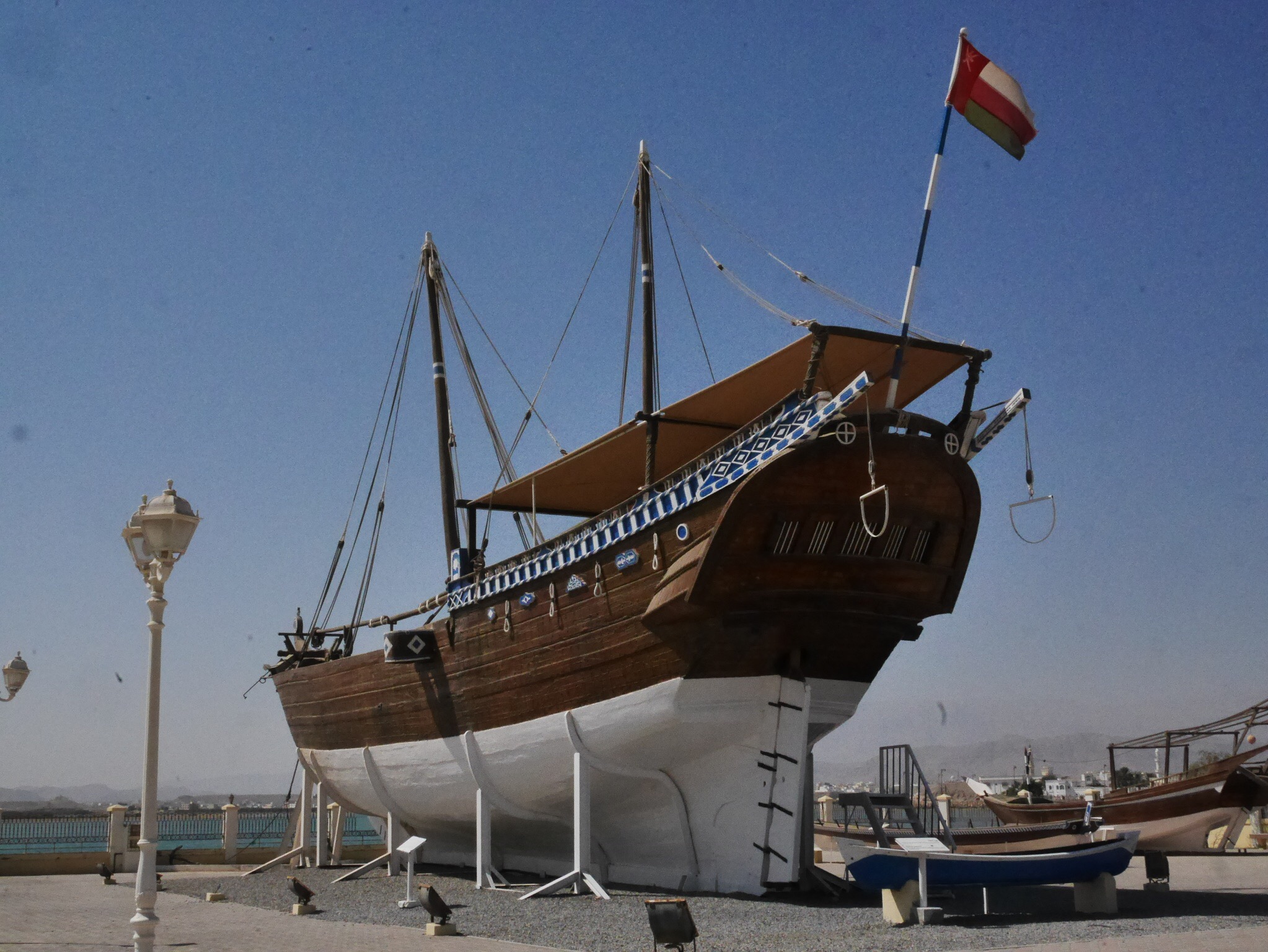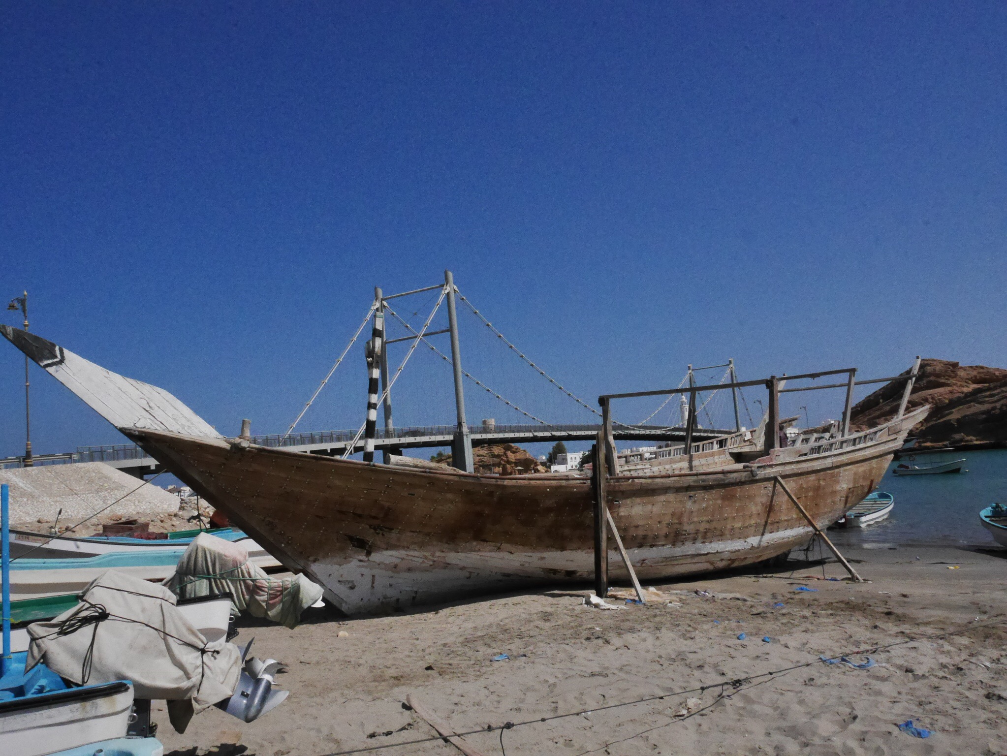 Around the corner from the boatyard is the last big fishing dhow made by the boatyard in 1951, supposedly the same type of vessel used by Vasco de Gama. It was bought by a Yemeni sea captain and then a local boy made good bought it back and the people of Sur raised the money to build a little park for it, where it is now beached. If Sinbad had a boat, this would be it. Actually Sinbad supposedly came from Sur so who knows. It was a handsome and exotic looking thing and it would have been lovely to have a look inside it but it was display only.