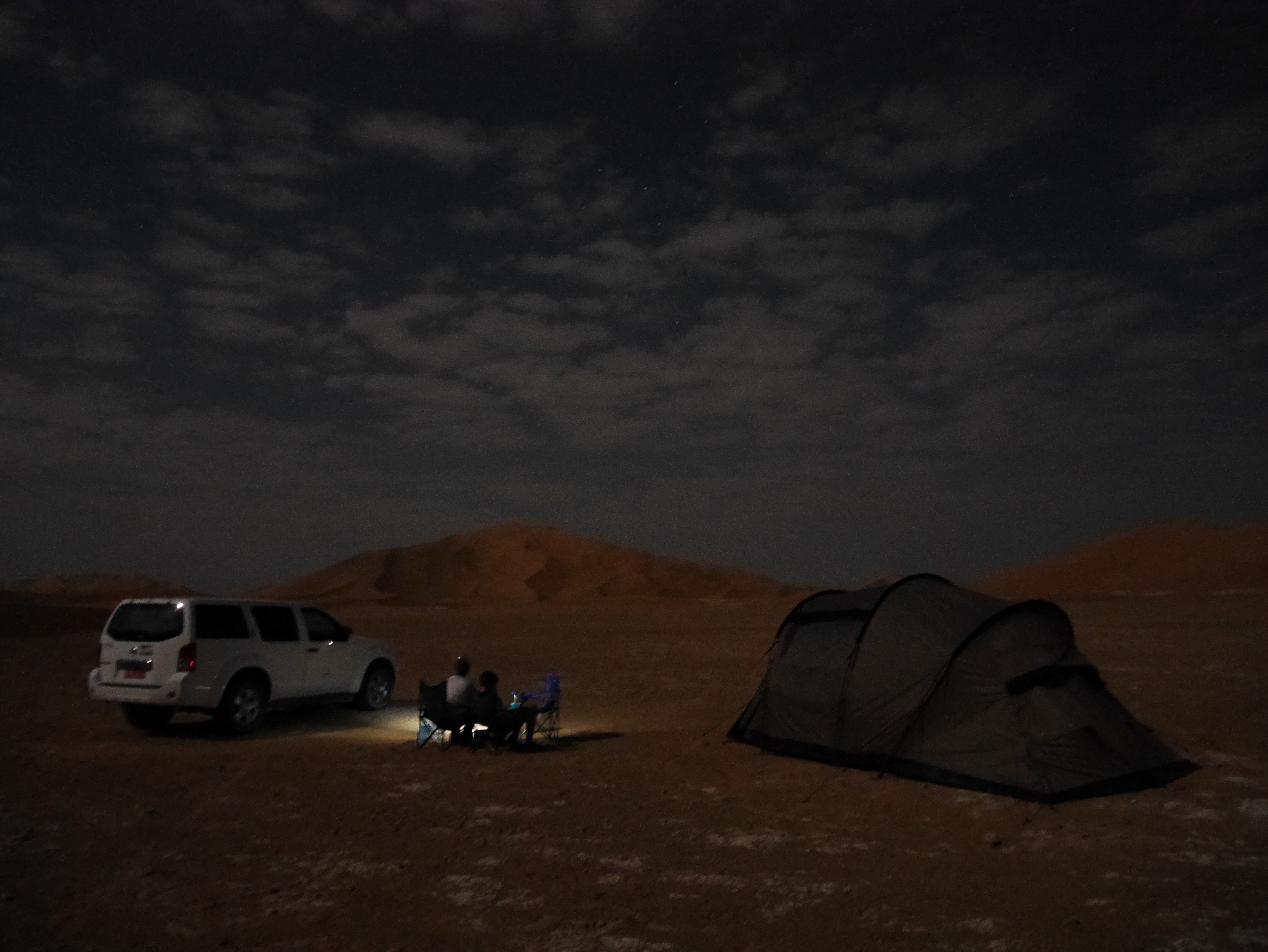 The sun was low, highlighting every ripple and curve in every dune. The sand was lit orange, peach and apricot. It was stunning. We drove on for about twenty K until we came to a huge curved dune with what could almost be a dried lake bed at its base. It was smooth and flat and perfect for camping. We drove across it and set up the tent in the lee of the dune.