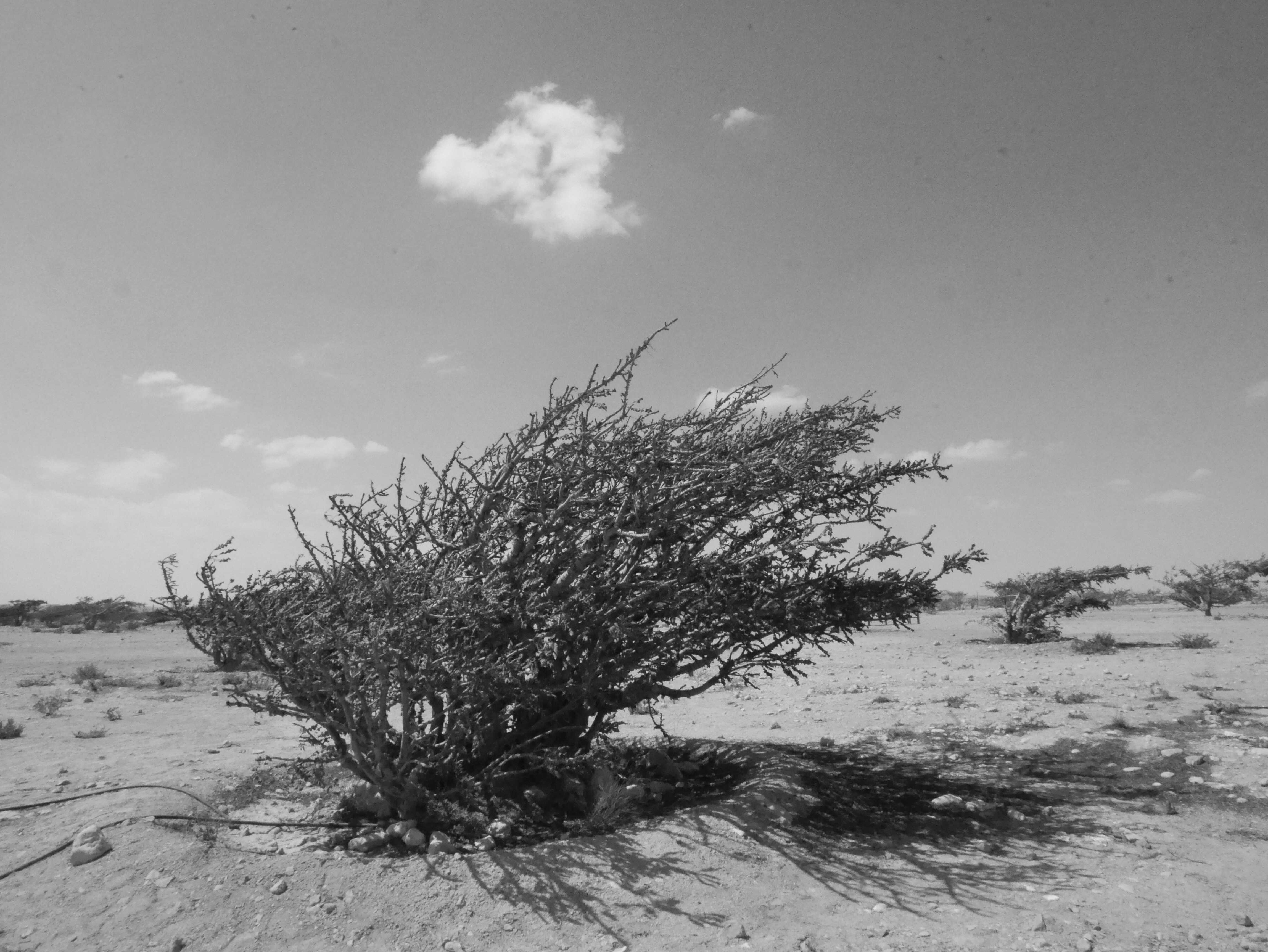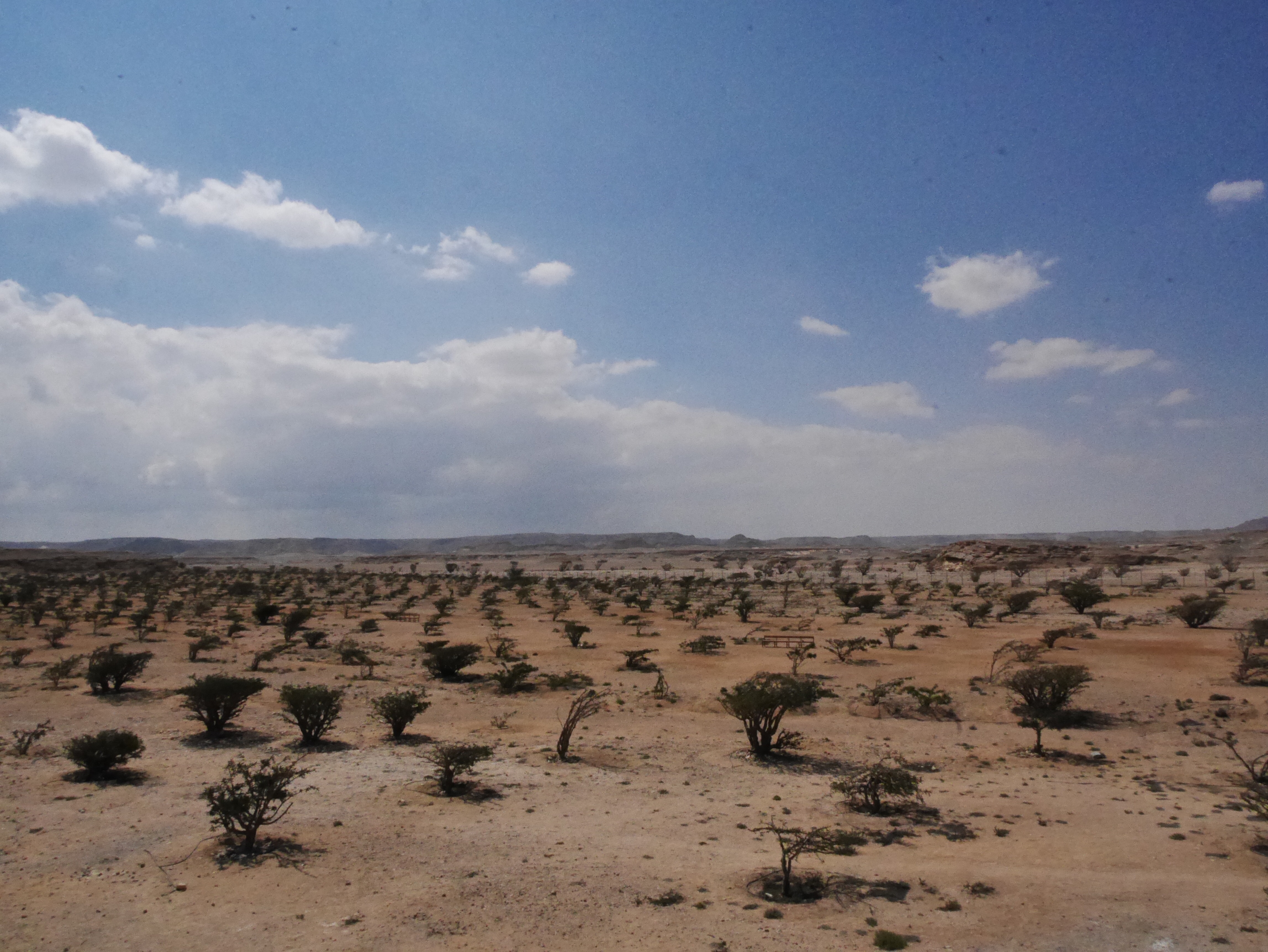 The road at this point was a proper six lane motorway with streetlights and speed cameras. But everyone pelts along it. We sailed through dead flat desert but some of it was being cultivated and there were odd buildings scattered around. We followed the old frankincense trade route and at one point we pulled over to see a small plantation of frankincense trees.