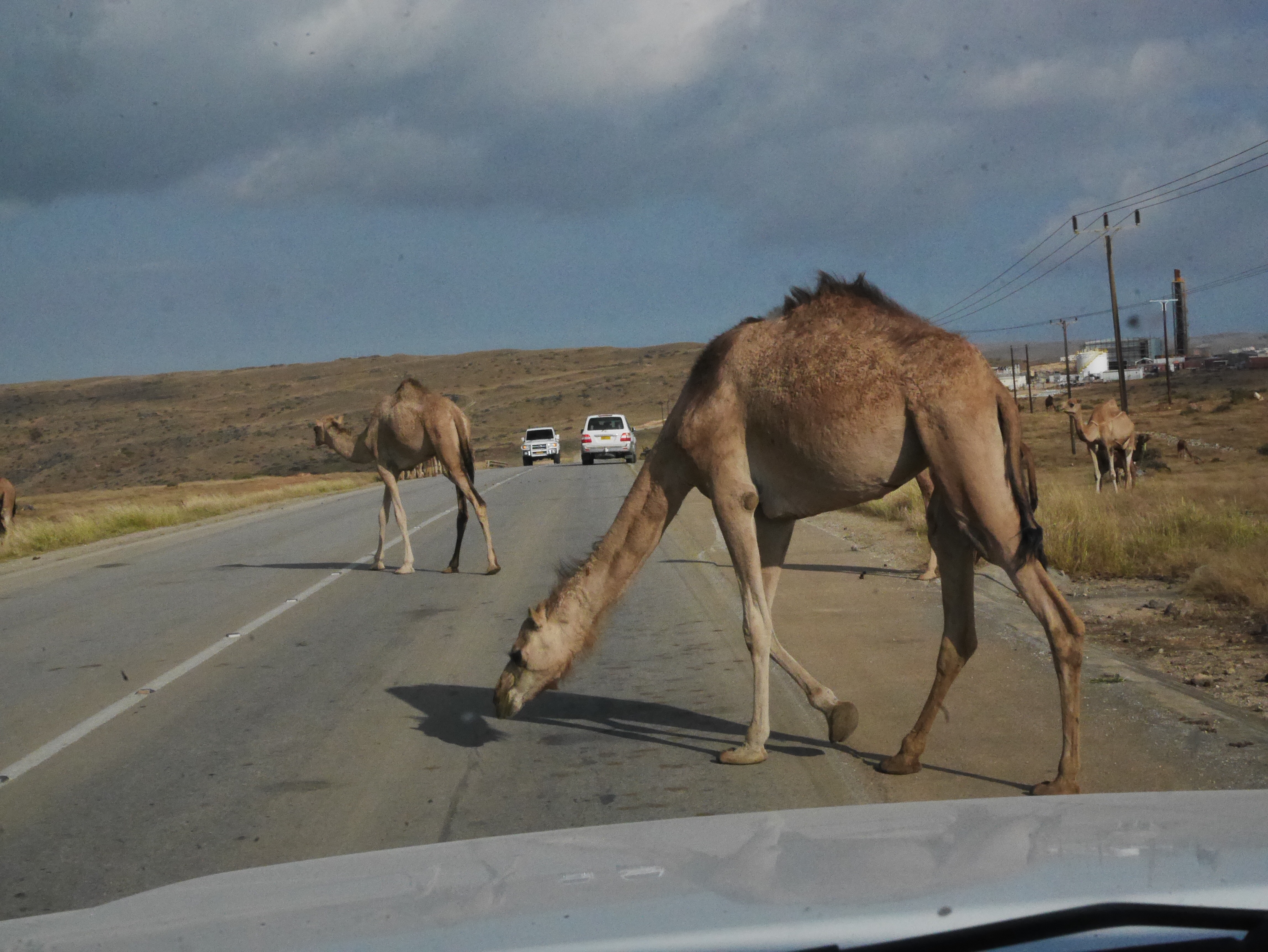 I called Nithin at AST and said were were sorted. Then we were on our way again, back to Shisr for fuel and a chat with a bunch of lads at the garage. They were in a jolly mood, messing about and avoiding the heat. They didn’t have much English but asked where we were from and where we were going. They were so friendly and such a striking looking bunch. Tall and slim with strong faces and white teeth. One had just been milking his camels and gave us a plastic bottle of camel milk which we put in the cooler. Thank you! Goodbye!