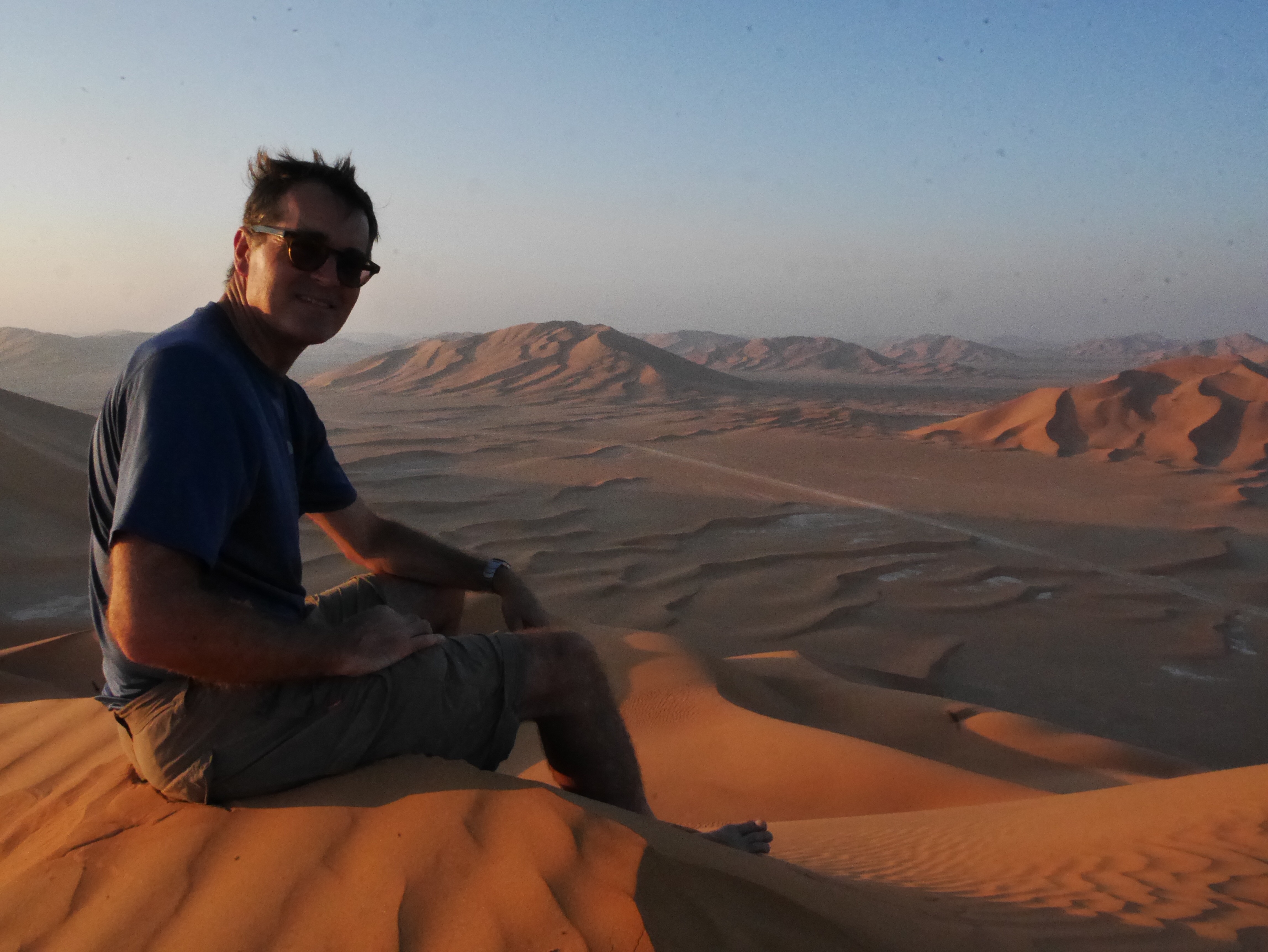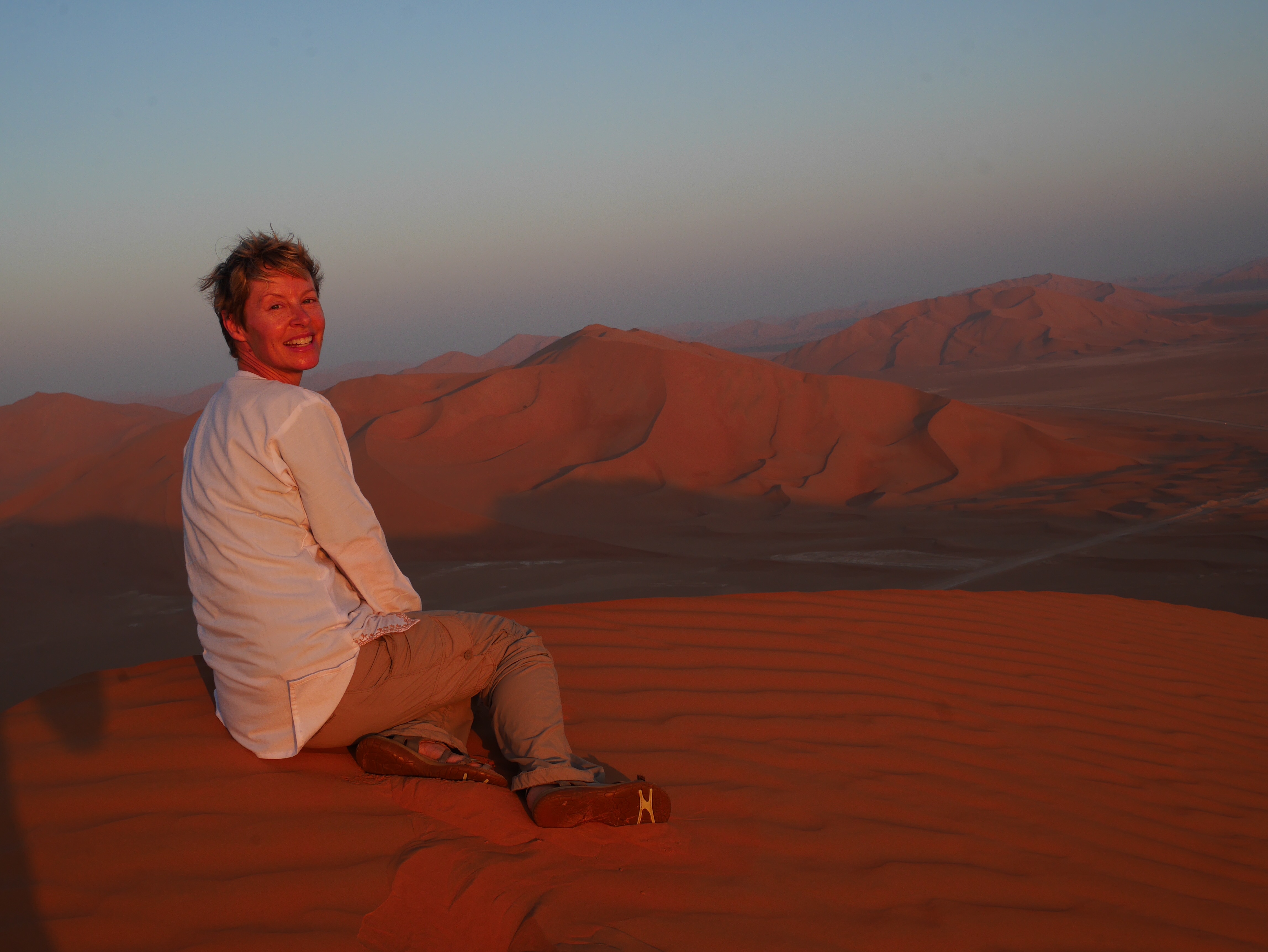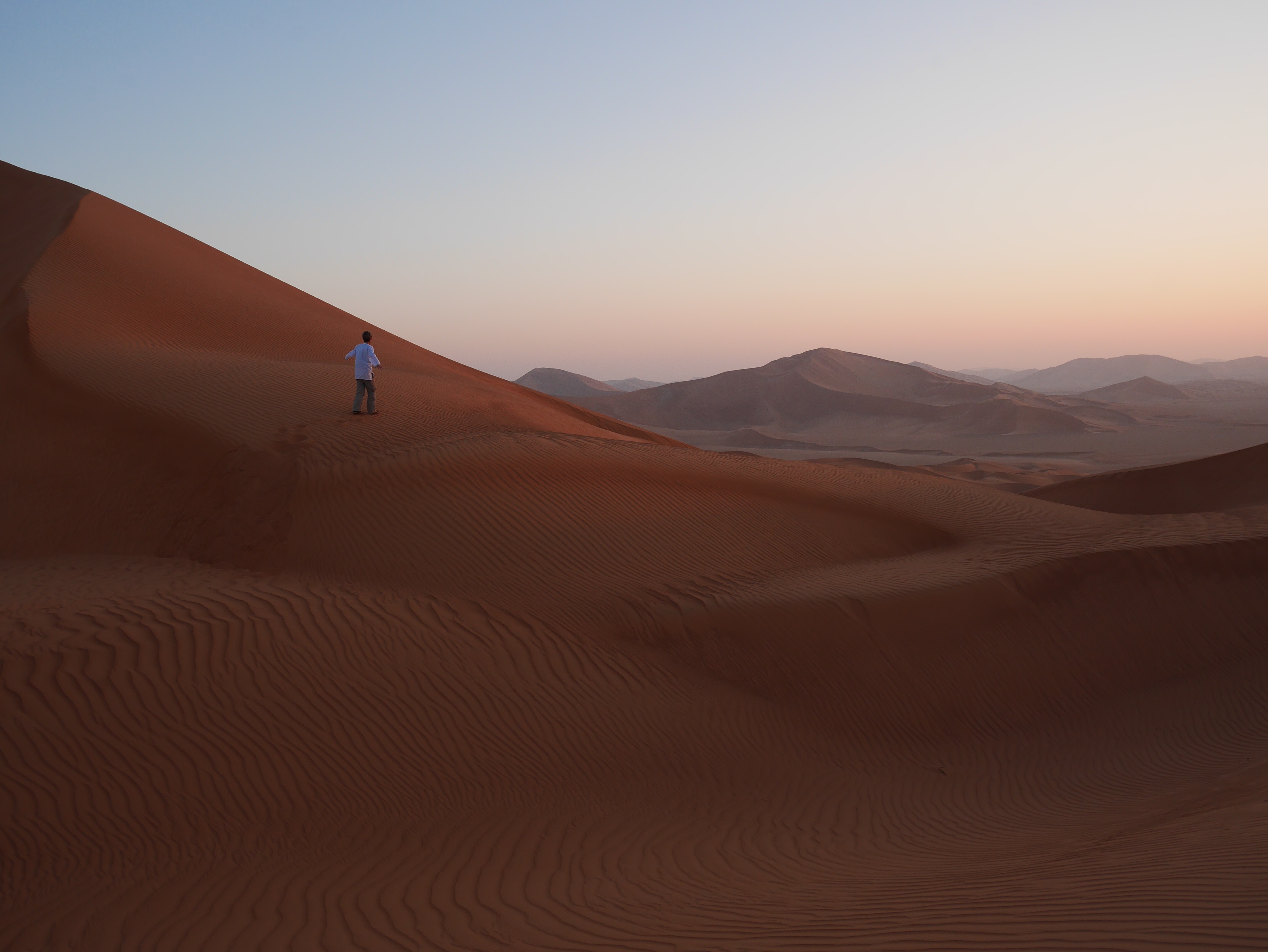 A gleaming sliver of pink sun was just emerging over the sand when I got there, and we climbed further up to see it rise over the sweep of the desert. Our tent and sleeping son were now out of sight far below. It was utterly peaceful and we watched the desert changing colour from tawny brown, to rust and amber and gold.