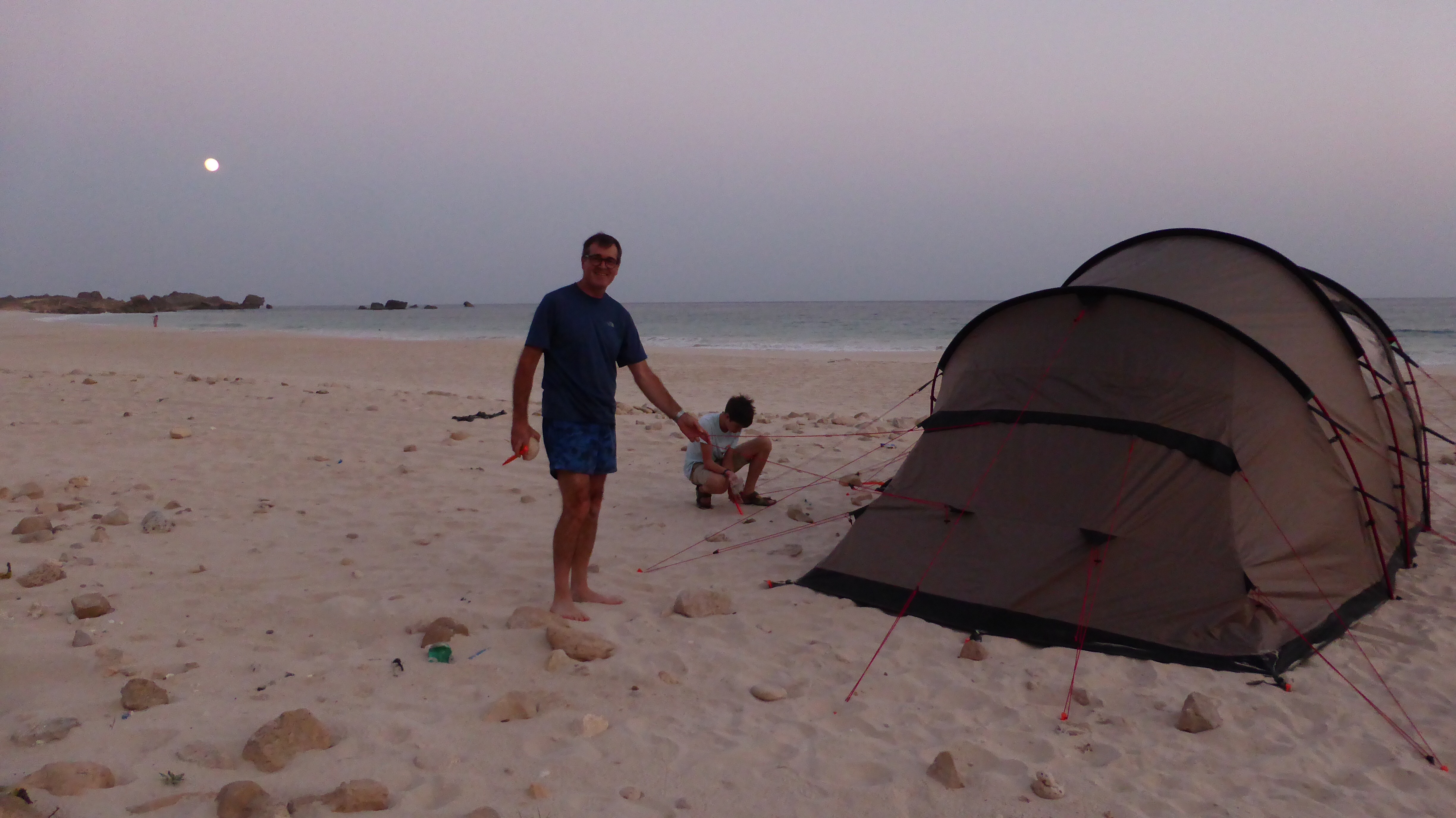At the sign to Fazaya Beach we turned onto a rutted track which went steeply down the cliffs, and into a beautiful broad shoreline with golden sand turning to scrub back to the cliffs. The beaches came and went for about five K and we went to the end before returning to the penultimate beach to set up camp. But first, into the warm sea. Big waves were breaking and we body-surfed as the sun set. A little further along we spotted Khaled with the Swiss family and brought him a pack of dates to say thanks. He made us sweet tea and we all compared notes on where we’d been in Oman. Pretty much the same itinerary in fact and we’d flown in to Salalah on the same flight too. Small world.