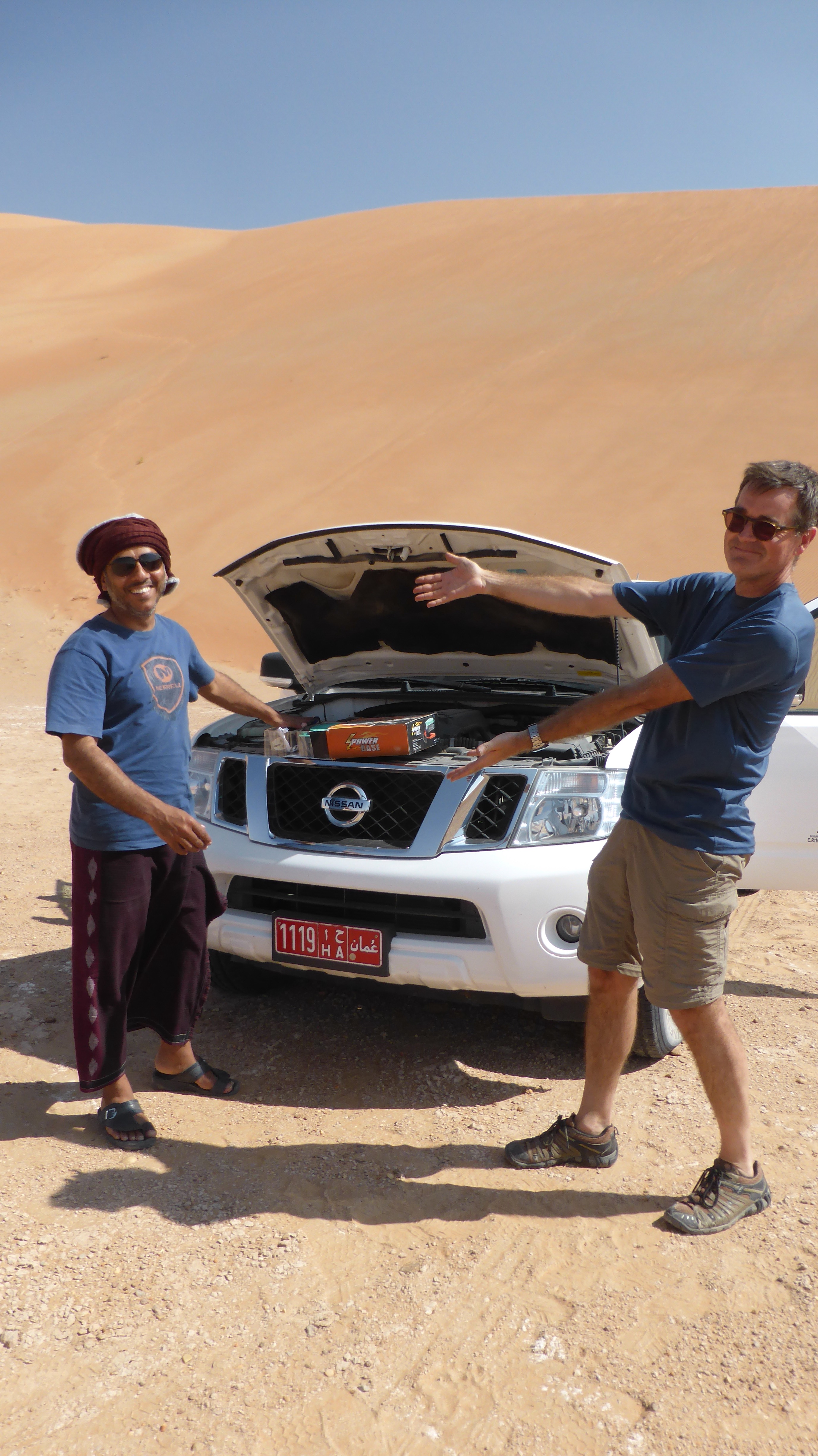We did at least have plenty of water, enough food and some shade, but if this was a starter motor issue, we would need a tow truck and the nearest garage was 100Km down the track in Shisr. And worse, it would kill the end of the holiday. Tom said “Well, I guess I can catch up on some homework” and pulled out his tablet. P reached for her Kindle. I switched on the satphone and dialled the car rental guy in Salalah. “That number is not available at the moment” said the voice. I rang the Muscat office and it rang out. It’s Friday – the weekend. But about three unanswered numbers later I finally got hold of the Muscat agent, Nithin. I told him what had happened and could hear him going white. “I’ll call you back” he said. But moments later we saw a white SUV off in the distance heading down the track and Tom and I waved it down. It was an Omani tour guide with a Swiss family coming back from a sunrise tour in the desert. They pulled off the track and drove over to our camp. Khalid the guide had a go with the ignition and we all thought it sounded like a starter motor problem. Then I remembered that my plug-in cigarette lighter adapter would also show what charge the battery had. I plugged it in: 9.4 volts. Enough to turn the starter a bit but not enough to properly engage it. Khalid had a portable battery pack, he attached it to our battery and vroom. We were sorted.
