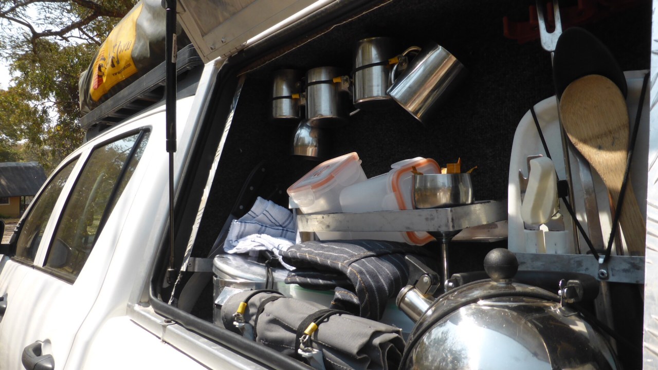 As we were eating, Tshidiso the Bushlore guy arrived with our vehicle. A serious, unsmiling man who was all business. It’s the same Toyota Hilux we’ve had before but in better nick and with better camping gear too. He took us through everything; from the cooking gas cylinders to the compressor for the tyres and using the high lift jack; “It’s dangerous. Try not to use it”. OK… The water tank was full, the fridge was empty.