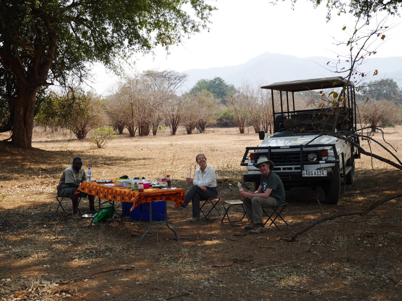It was a pleasant drive through a stark and lovely landscape but P and I were exchanging the odd raised eyebrow about the lack of animals. So, lunch in the shade of a big tree and a chat with Akim, who lived in one of the riverside villages we had passed near Leopards Hill Road. “Four children” he said beaming.