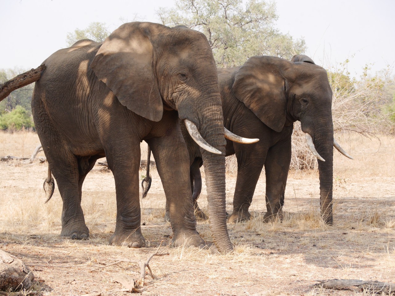 There used to be a couple of small chalets there years ago and they’ve repurposed the concrete bases to be open-air bathrooms, surrounded by reed thatch. There was an oil drum shower which they filled with water they’d heated over their fire. It was the perfect temperature and so nice to get clean again after a hot and dusty day. We watched the sun go down over the little strip of river. No hippo here, for the first time since we left Pioneer Camp in fact, but elephant were grazing in the old riverbed.