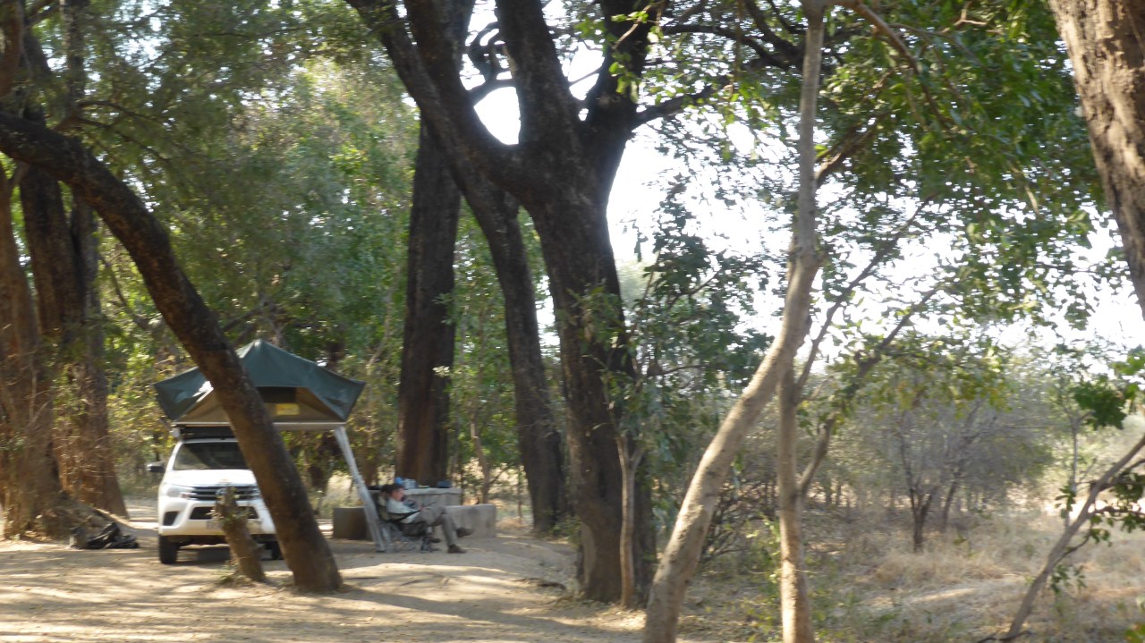 The track smoothed out and we were coasting over mud or sand between mopane trees and scrub towards an entrance to the National Park, an elbow of which crosses the river at this point. At the entrance gate we gave our details to the ranger and expected to hand over the $105 (!) entrance fee. “Transit?” He asked. “Yes” as we were going out the other side to our campsite. “OK that’s it. Enjoy the park”.