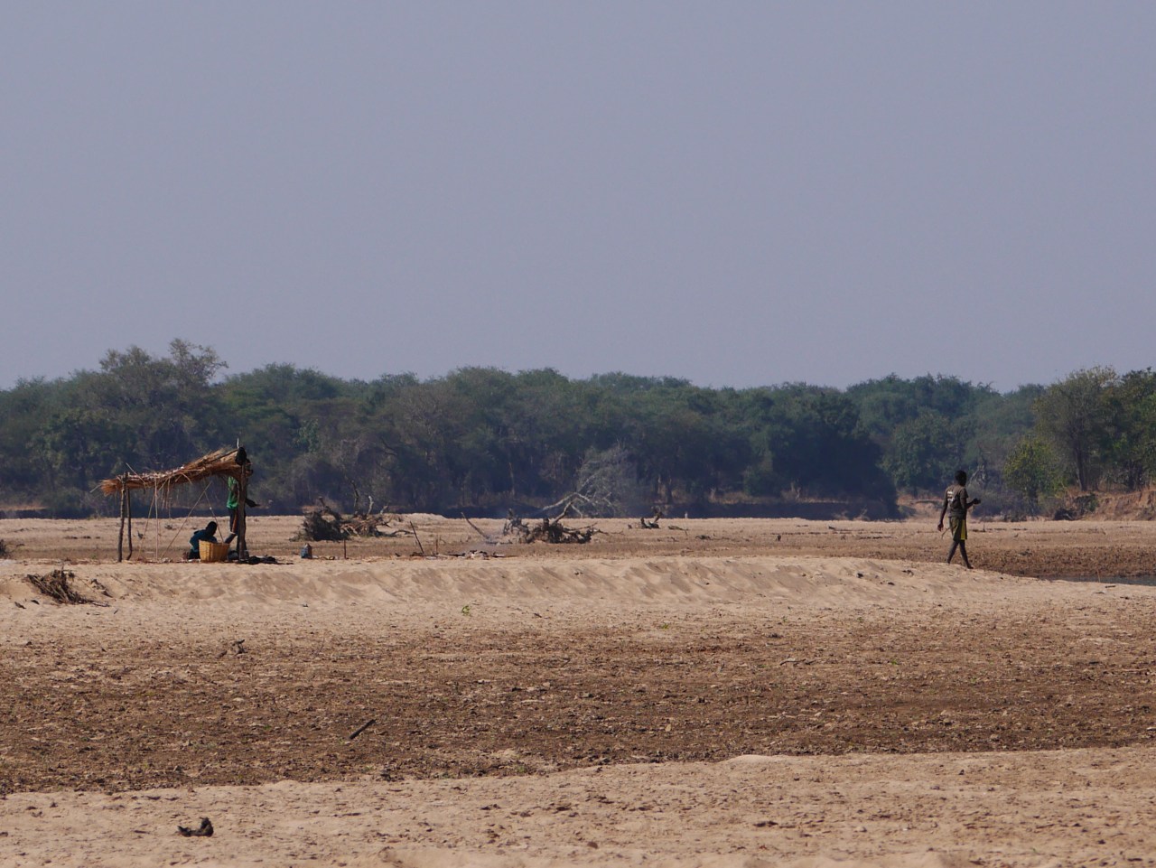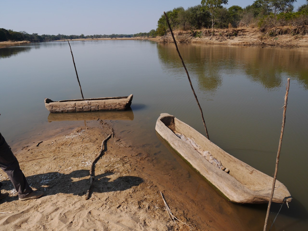 Later we met up with our scout and one of the attendants for another stroll. We went upstream this time via another fishing camp where they were mending nets in the shade. They seemed determined to find us an elephant and we went back into the bush for a good king look but nothing doing. We came back to the sandy riverside but the attendant said “we should not stay here long. This is where the elephants come to the river.” The people here are really very wary of them. And with good reason. I’m suddenly reminded of a road mender who stopped us at a narrow section to wait for the traffic to come from the other side. He showed us a DVD in a box with a photo of an elephant standing over a man it had just killed. “He was a chief and killed by this elephant.” said the lad “I video’d his funeral and want to release this DVD but I’m still waiting for the family’s permission”. We tried to give a nod suggesting sympathy for his artistic frustration.