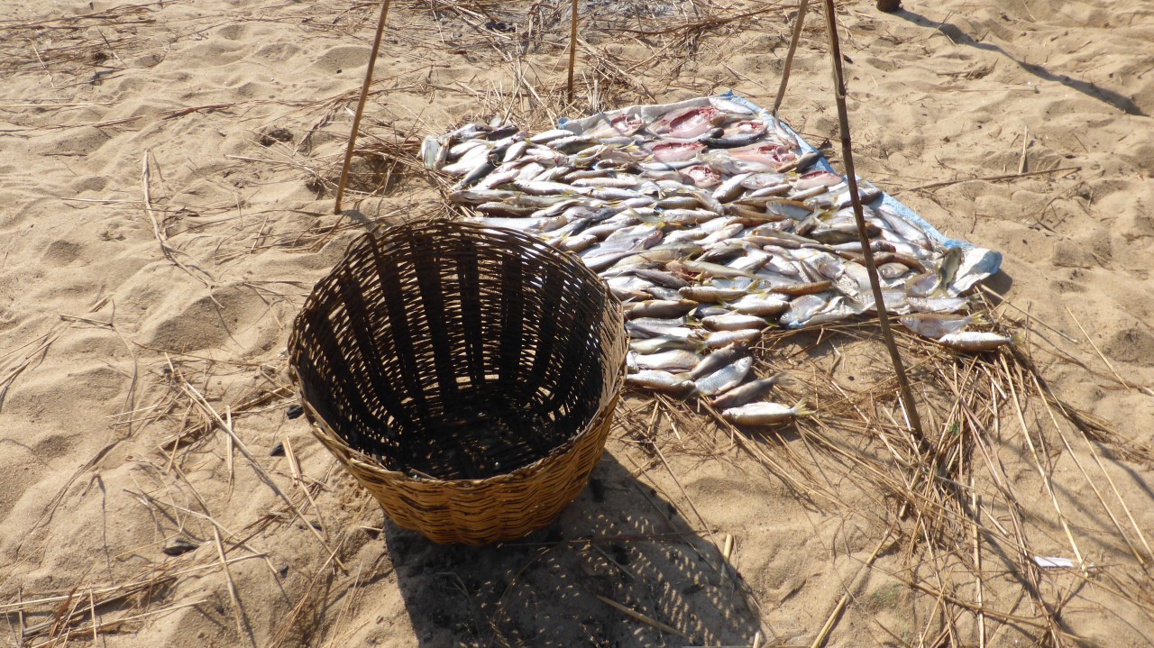 A platter the size of a dustbin lid was packed with fish like big sardines, drying in the sunshine.