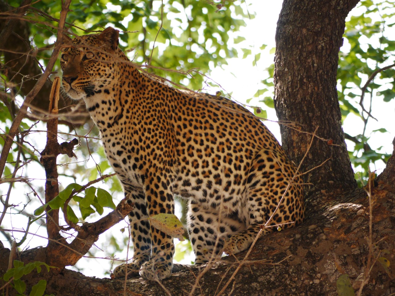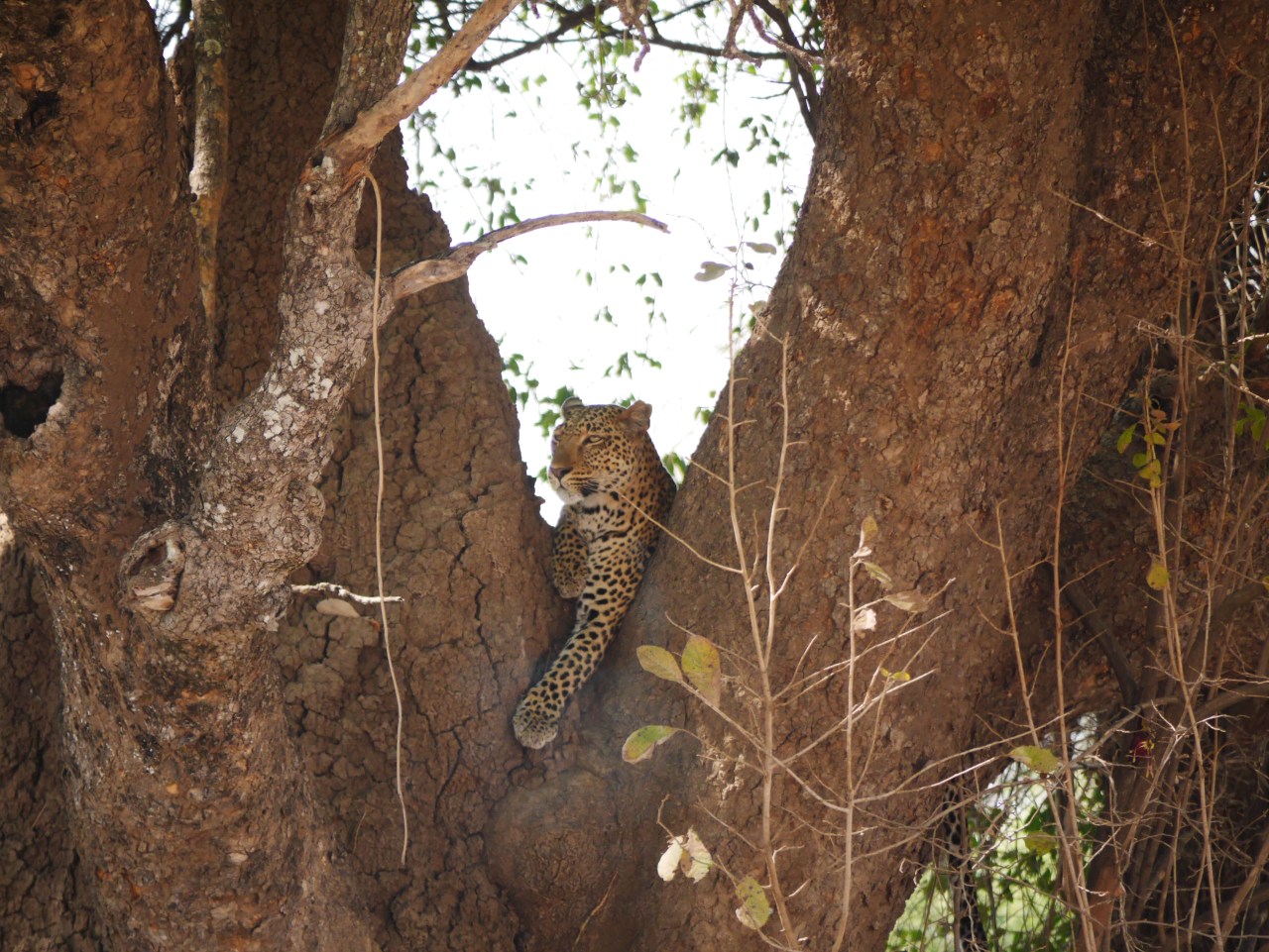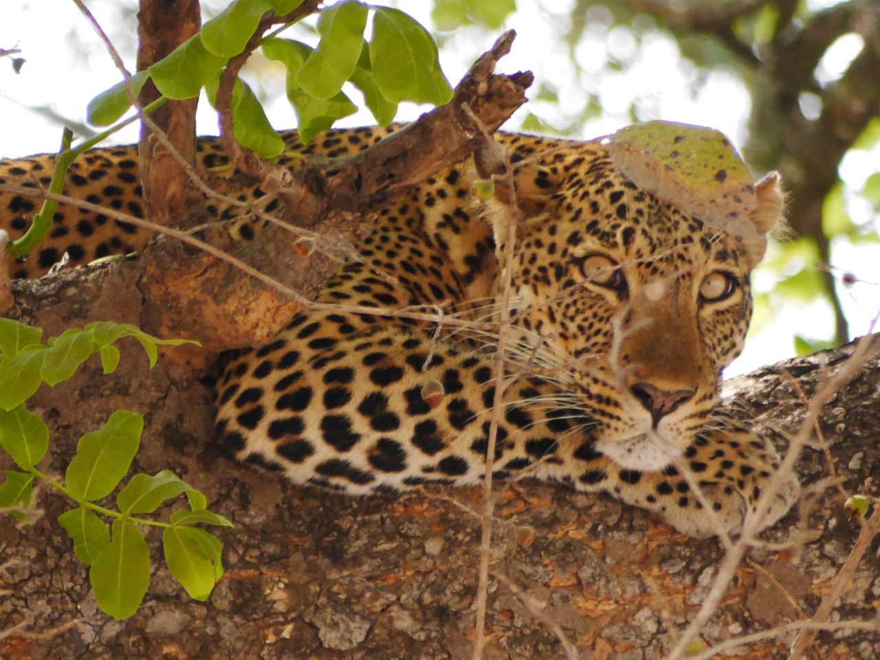 Well today our luck was in. We were heading back to Flatdogs in the last fifteen minutes of our four hour game drive when we went to see what a couple of other vehicles had stopped to look at. In the fork of a tree a beautiful female leopard gazed down on us.