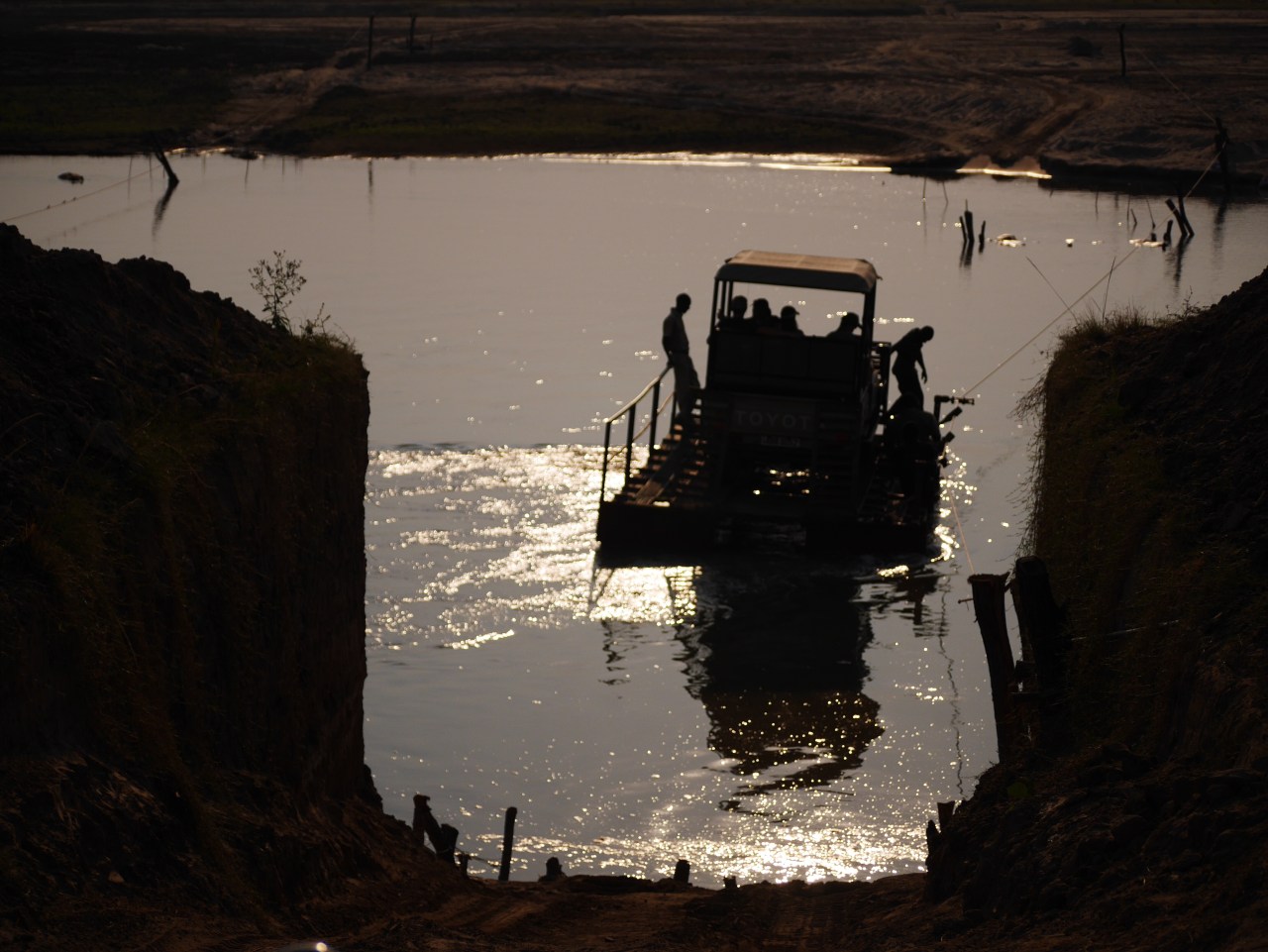 Two lithe and muscular guys pulled us across using wooden handles which slipped onto the cable and worked as levers like oars in a rowing boat. Ten meters short of the bank we drove off the ferry into the water and out the other side. Well that was fun!