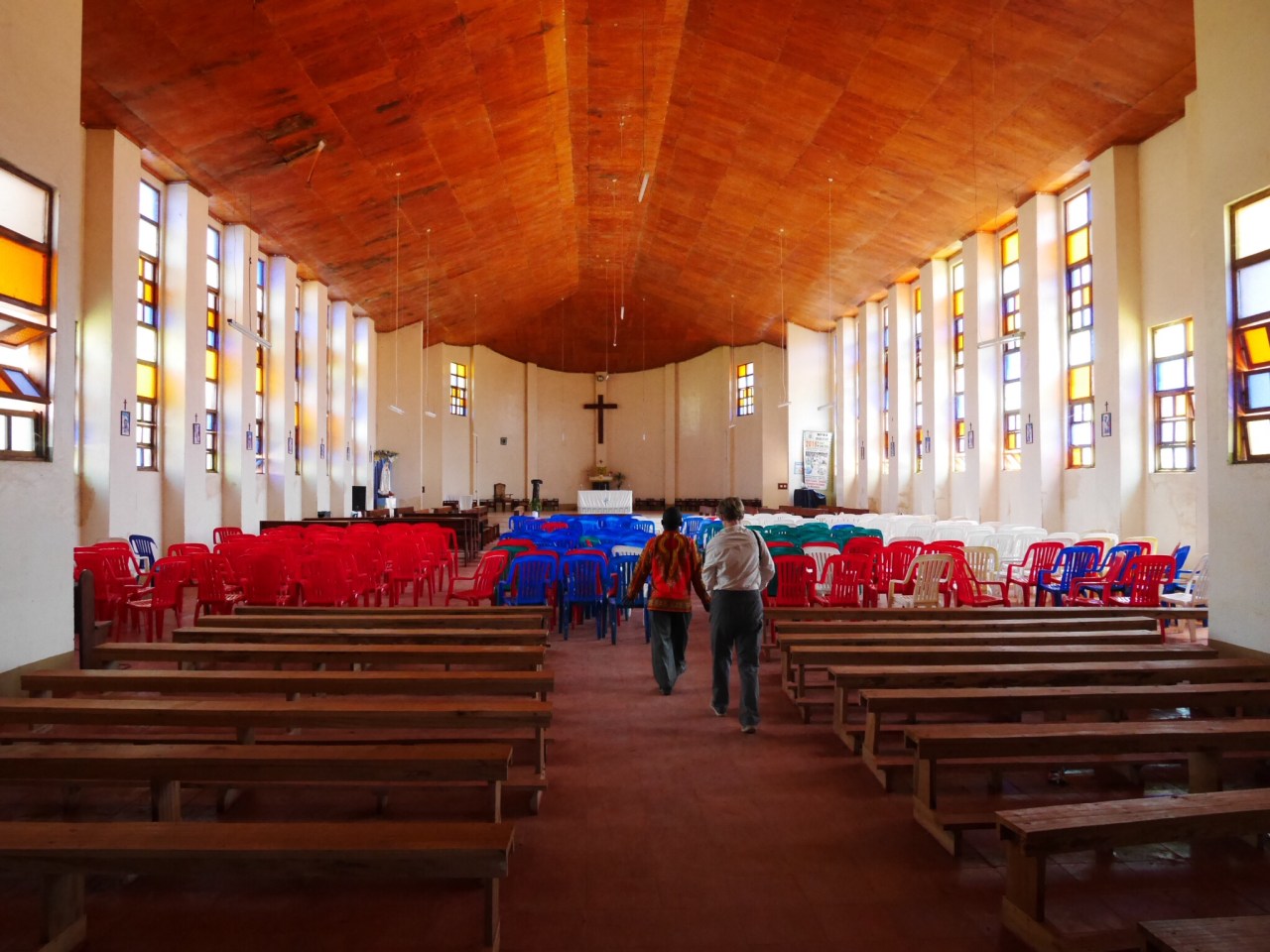 It was a vast airy building with coloured glass in the windows, packed with plastic chairs. “We hold two masses on Sunday and the church is full” he said proudly. “There are people standing at the back and others who have to sit outside because there is no room. We want to build an extension but first we must finish the clinic”. The monks are building a medical clinic across the street and clearly the mission is the anchor for the whole community. We would never have seen it if we hadn’t got lost.