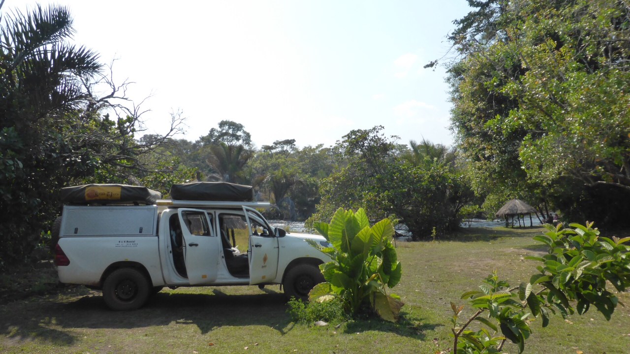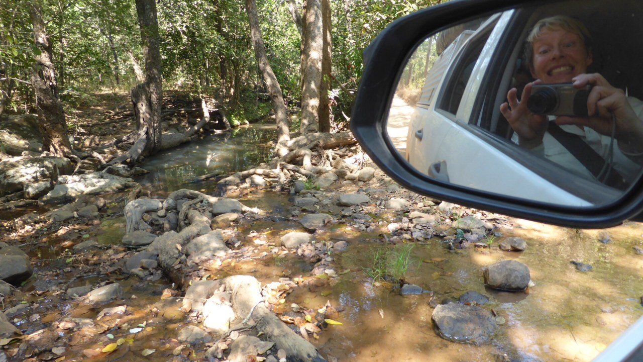 With no T4A satnav map to follow, the park map was our bible and puzzlingly none of the marked features seemed to appear and the track got worse and worse. We came to a big T junction which wasn’t marked and we took a turning left (the direction of our destination) which ended up at a choice between a river crossing or continuing along the bank. Some guys in a pickup were filling a large drum with water and we flagged them down. “Can we get to Mano Gate this way?”. “Yes, but you have to go across the river, find a right turn, then two more river crossings. It’s quite difficult”. “Do most people go the other way?” “Yes”.