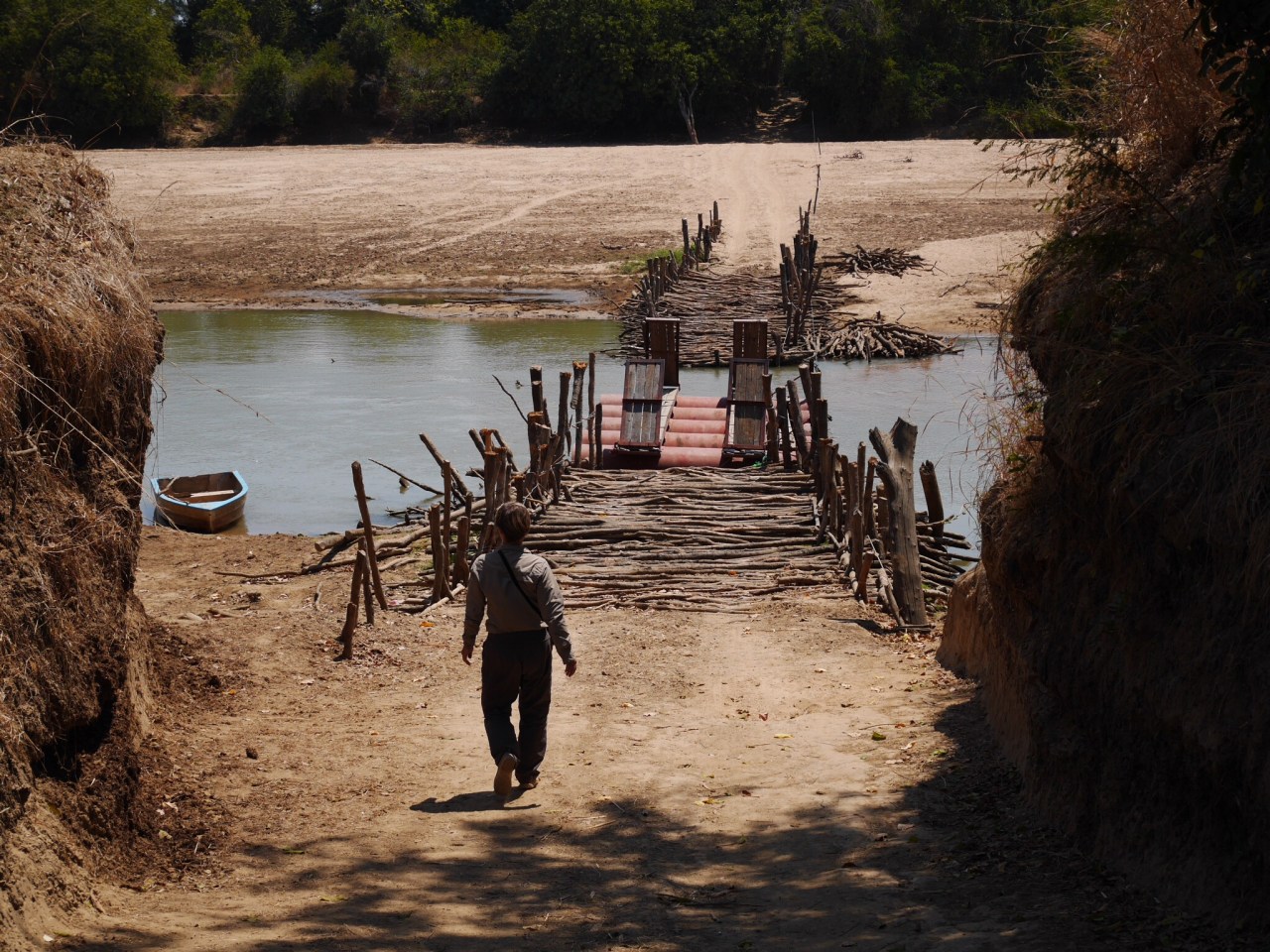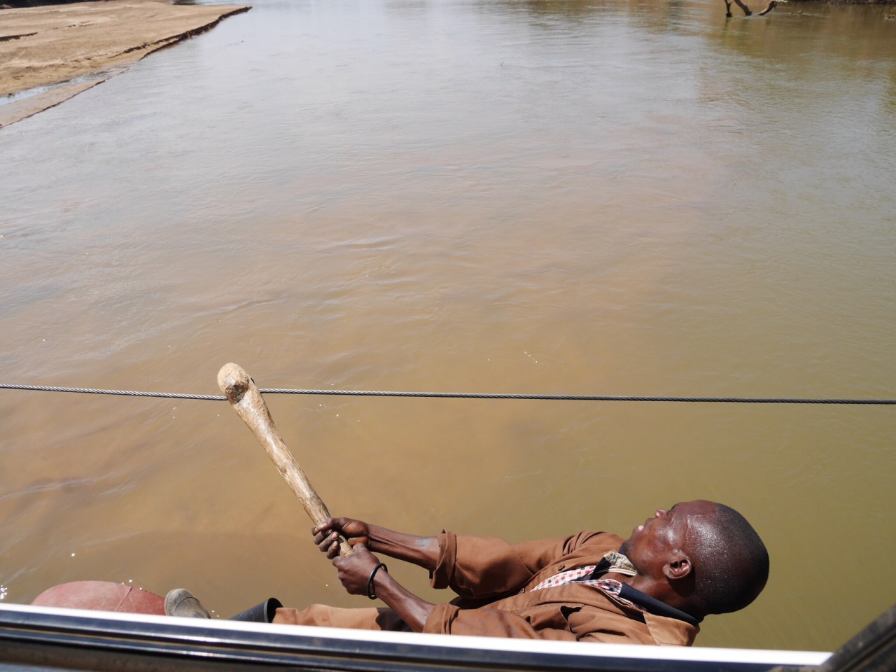 It was just big enough for one vehicle, and the approach was on a rough mat made from tree branches that was fiendishly difficult to drive over. Once I’d driven on, Philippa and Tom were allowed to get in, sidling along the edge of the pontoon. The pontoon man attached a wooden handle to the cable and began pulling us across. It was very hard work and I wondered what would happen if we got stuck.