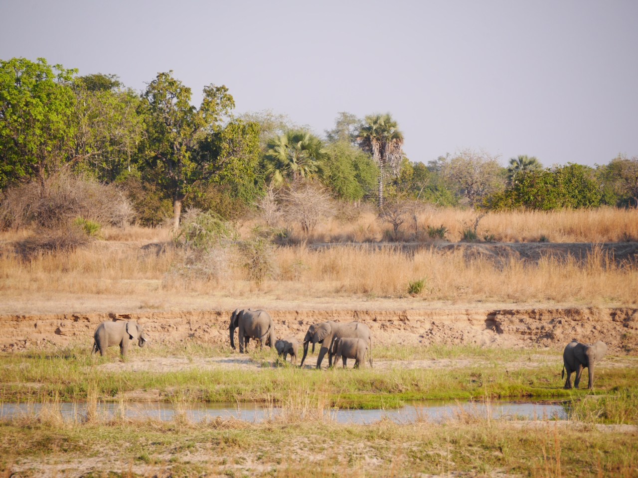 We set off in the late afternoon light walking alongside the river. It’s so shallow at this time of year that all the hippo and crocs have gone down the Mwaleshi to the Luangwa River (where we camped at Kanunshya). It was the first proper exercise we’ve had since we got here and lovely to be outside in a landscape lit golden by the late afternoon light. It perked us all up. Because so few people come here, the animals are skittish around people. We saw kudu and other antelope vanishing off ahead of us and a fine family of elephants having a drink.