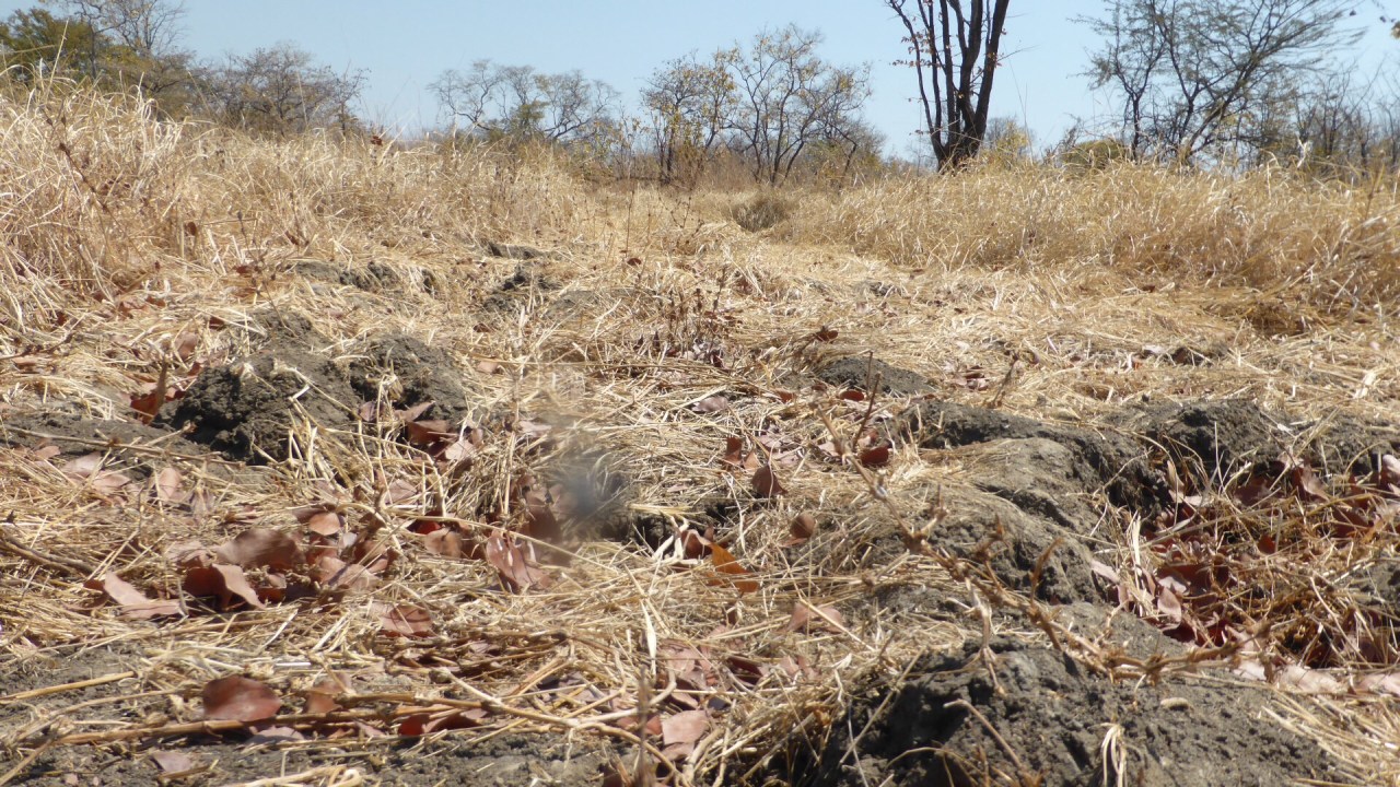 Before long we came to a section of “river soil” overgrown with dry grass. River soil is the rich silt churned up in the rainy season; a black goo that dries rock hard with deep fissures and potholes left by elephant feet. It is the absolute worst surface to drive over.