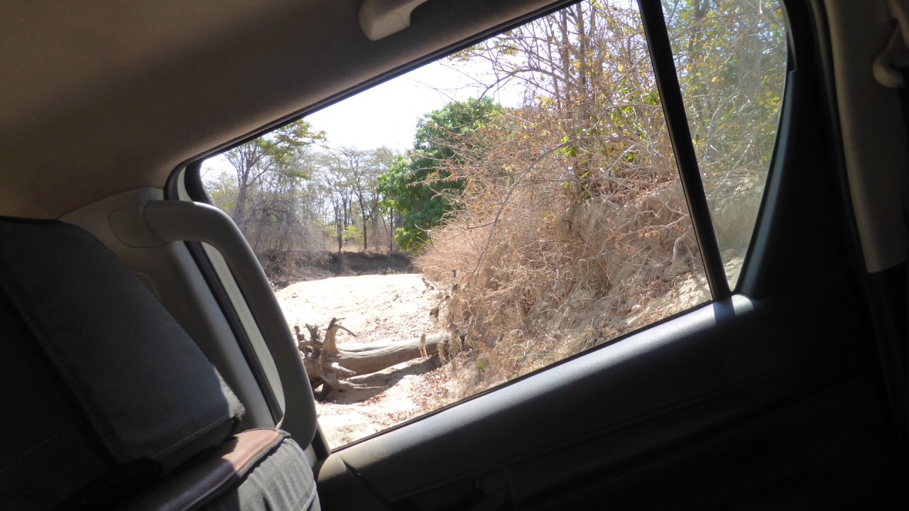 Despite all the concern about aggressive elephants we hadn’t seen any, apart from at a great distance on the opposite side of the river. But within a minute of driving out of the camp there was a female showing us her ears to our right – a bit too close for comfort. At the same time, perhaps twenty meters ahead, three more were coming out of the bush and crossing the road. The one nearest us was getting agitated but backing up would move me closer to her and going forward meant driving towards the others. Our scout went rather serious and had me wind up my window. Suddenly there was an angry trumpeting from the big tusked male ahead of us and it ran across the road, its gaze fixed on us, ears flapping. The others ran with it, deeper into the bush. Quite a moment. “That’s what I’m here for – to protect you” said our scout, smiling.