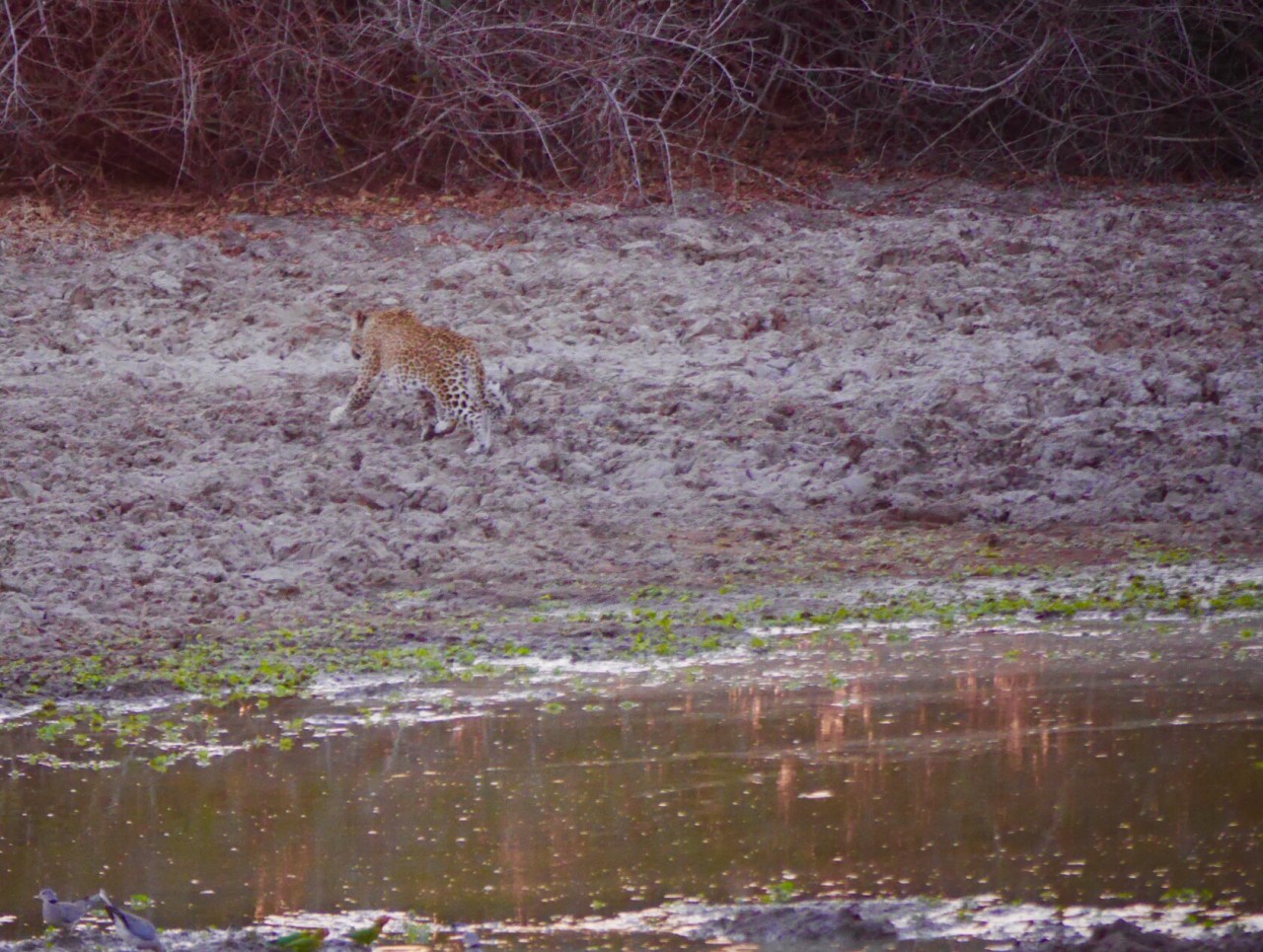 That’s the curious thing about a game walk I suppose. You want to see the wildlife, but not get in its way. Still though, there was an air of disappointment about the walk. I think they had been looking for rhino but it wasn’t to be. The vehicle was waiting to take us to watch the sunset by a watering hole and it was all a bit quiet as we drove. But as we reached the muddy patch of water, all three guides suddenly became animated. There by the water was a leopard. She let us watch her for only a moment before flouncing off, snapping at the flies buzzing around her.