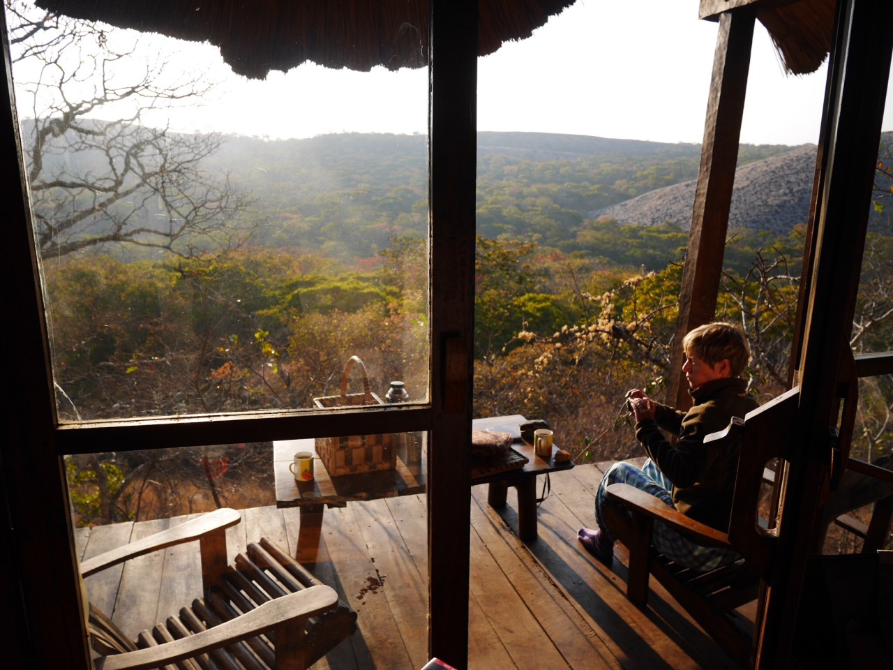 Breakfast was in an open sided thatched hut, looking down over the “whaleback” hills around us. We were the only ones there.