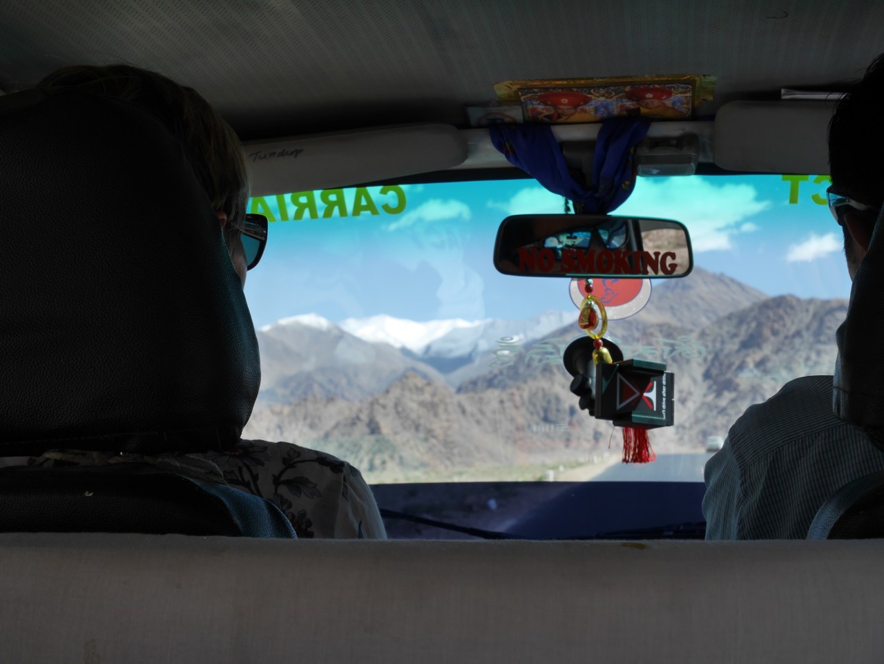 The same cab driver who picked us up at the airport, met us again in his tiny van. He’s a friendly chap, quick to point out the various sights en route; the confluence of the silty grey Zanskar river with the blue Indus river, the new Ladakhi University campus and the snowy peaks of the Karakoram off in the distance.