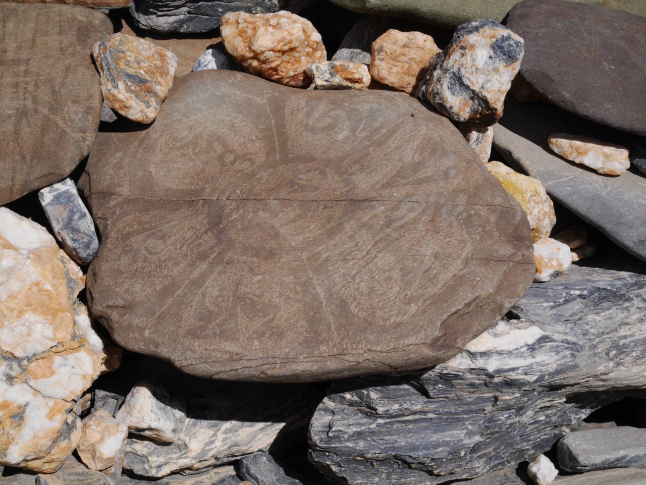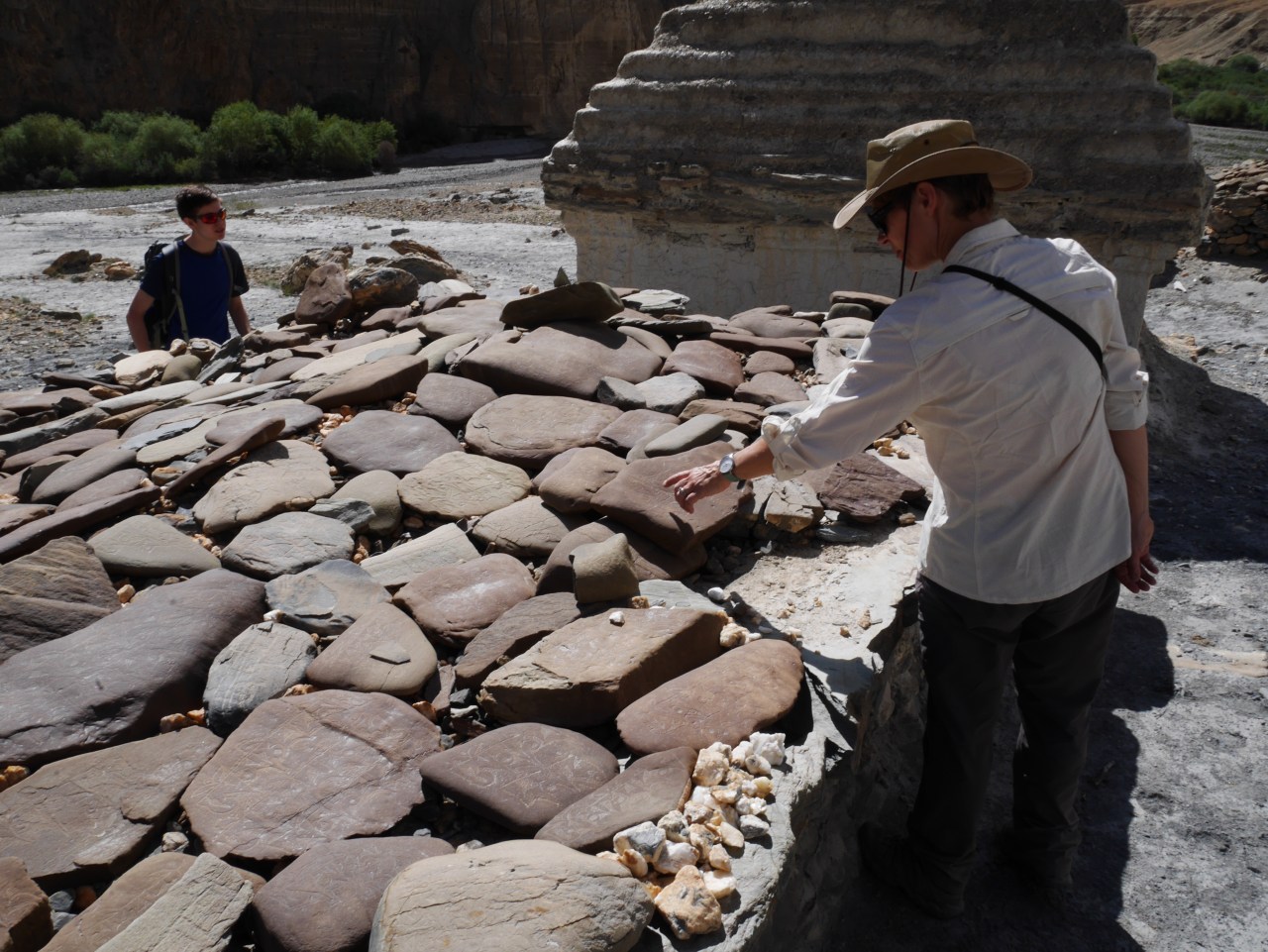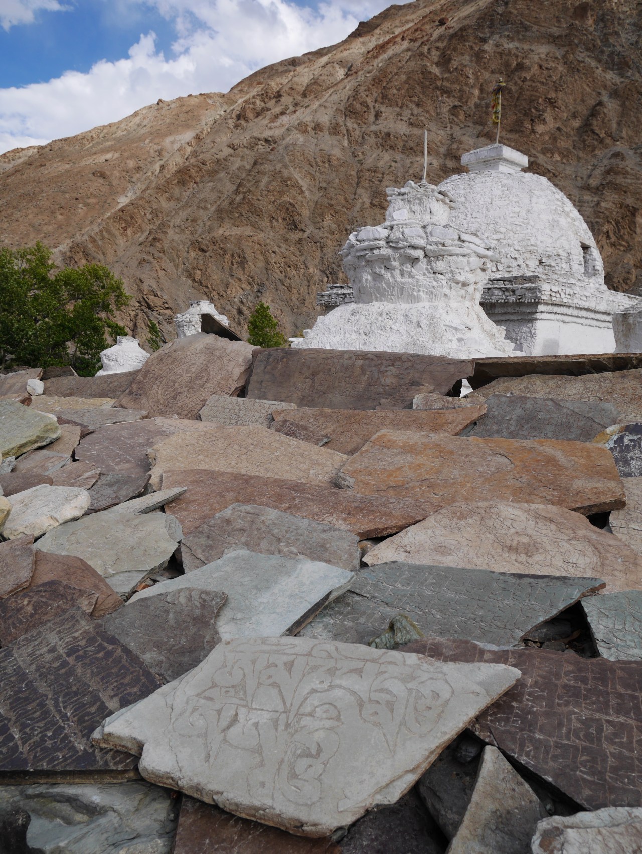They are the focal point of reflections on the dead. Sonam told us that the remains of holy men were buried in the oldest stupas but ordinary folk built them to house sacred texts and to be a reference point for their worship. Behind them are low rectangular rock constructions, covered with flat stones inscribed with prayers.