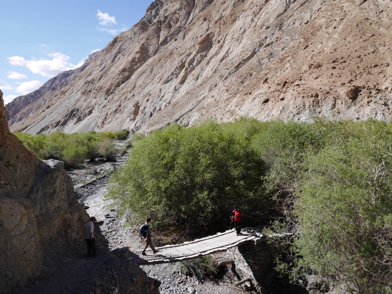 Last night’s supper was a robust affair. A delicate spicy/sour vegetable soup with crispy poppadoms followed by platefuls of fat pasta in a vegetable stew. Tom thought it was more like gnocchi and it had that same dense chewyness to it. It was all cooked and served by the lady of the house in the tiny corner kitchen which all Ladakhi houses have, tucked away amid the gleaming pots. It was to be an early start as it’s the longest hike of the whole trek – around 21K – and Sonam wanted to be off while it was still cool. We made plans for breakfast at 05.30 and settled down for an early night.