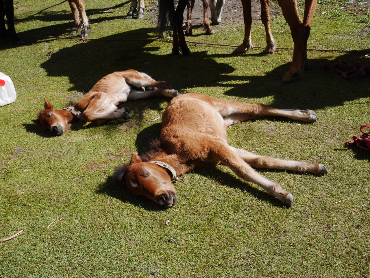 There was a small group of horses at the spring loaded with what looked like camping supplies. They were dusty little animals with colourful embroidered blankets and wooden saddles. A couple of foals with them were sleeping in the sunshine.