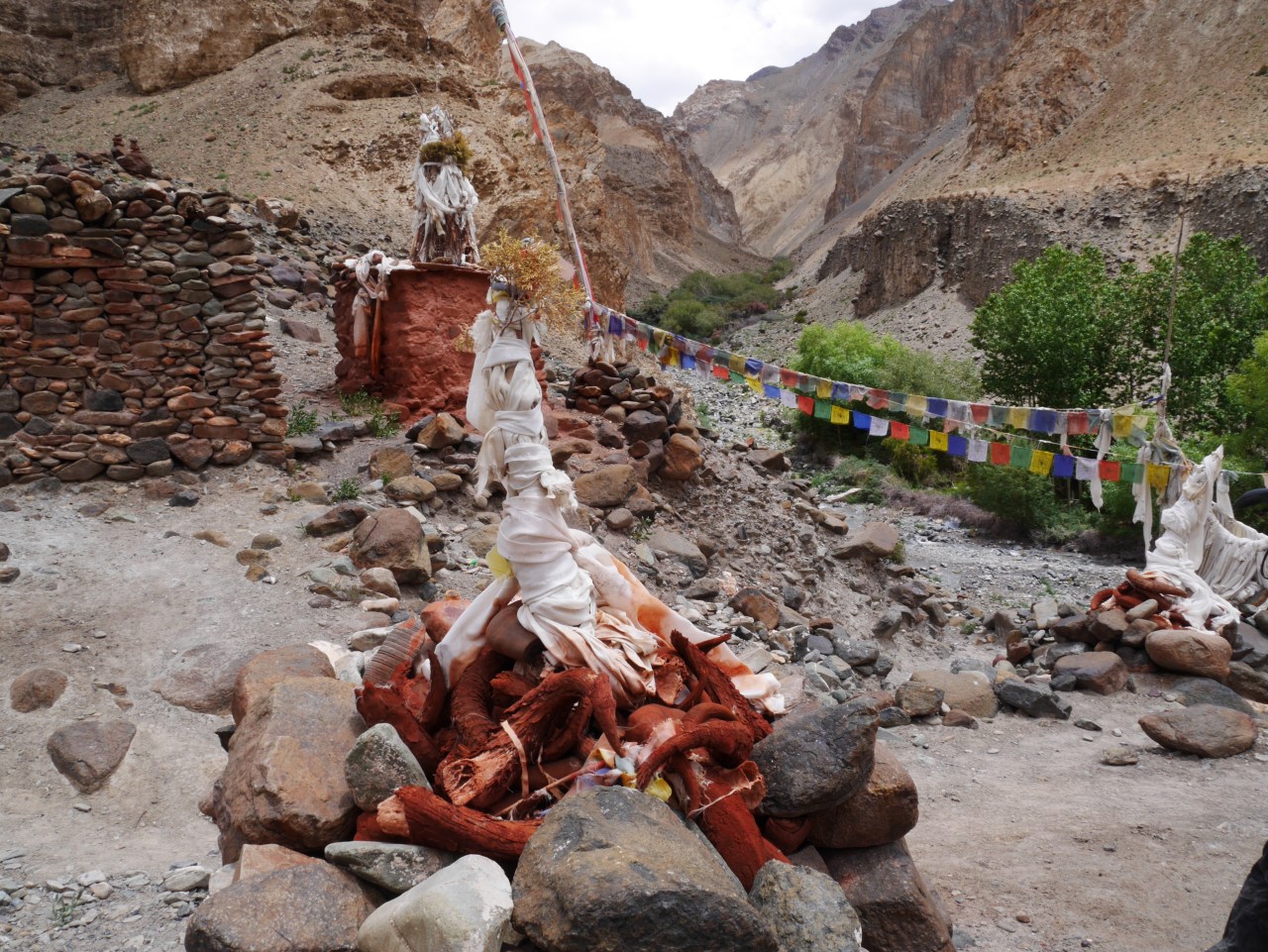 Occasionally we passed shepherds huts built into the rock face. The piles of thorny brush on the walls of the corals next to them suggested they were still in use. A little further on Sonam pointed out a “latto” belonging to one of the villages. It’s the shrine where villagers conduct regular rituals to ensure that their community is protected, or prosperous or is safe from wolves – or whatever the need is at the moment. This one was surrounded with offerings of red painted ibex horns.