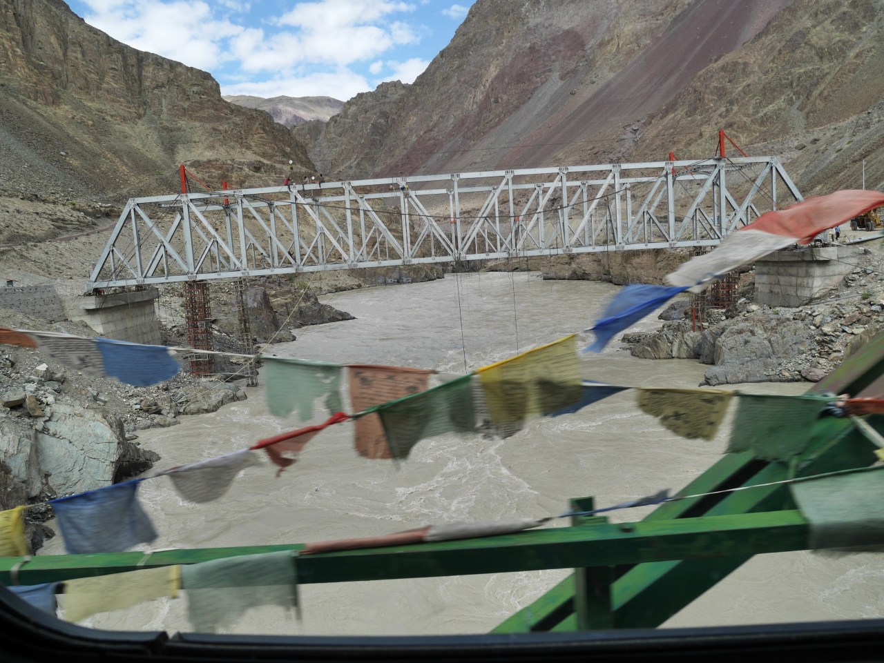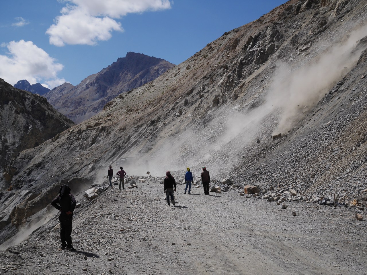 The flat and creamy waters of the Zanskar surged up into rapids along the way. Last year they carried off a bridge and bits of the road which are now being rebuilt. The tarmac gave way to a narrow gravel track lined with workmen and women shifting rock by hand in the dust and the fierce sunshine. On one stretch we had to stop for half an hour or so as an avalanche of rock filled the road ahead.