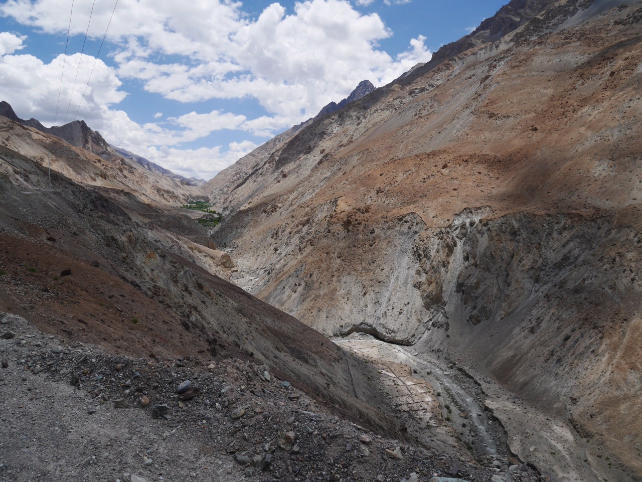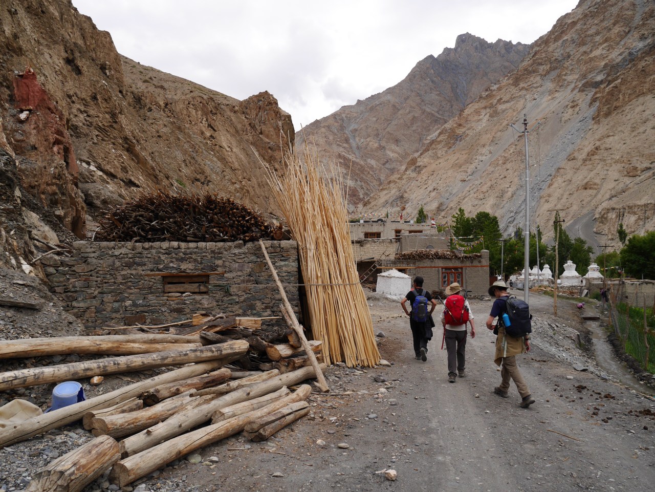 Sonam wanted to take us along one of the old trails along the river but within five minutes we came to a place where the path had eroded and was now a treacherous wedge of gravel about the width of a human foot which dropped off towards the river thirty meters below. Sonam had made it across but this really looked too dangerous and we declined. Sonam came back across and one foot briefly slid out from him as he did so. He led us back to the dirt road: “There is a network of old paths here” he said “but now most people use the dirt road the paths aren’t used and they aren’t maintained any more’. Not taking the short cut meant a steep climb between the dirt road switchbacks which left us all gasping, but once up we rejoined the dirt road and the going was easier.