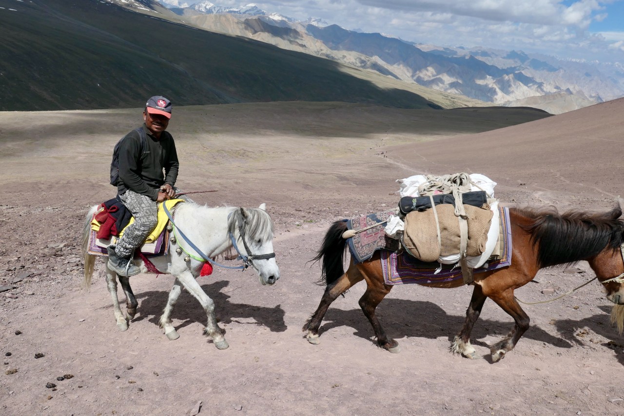 Our horseman Golpay catches us up with his line of reluctant ponies.