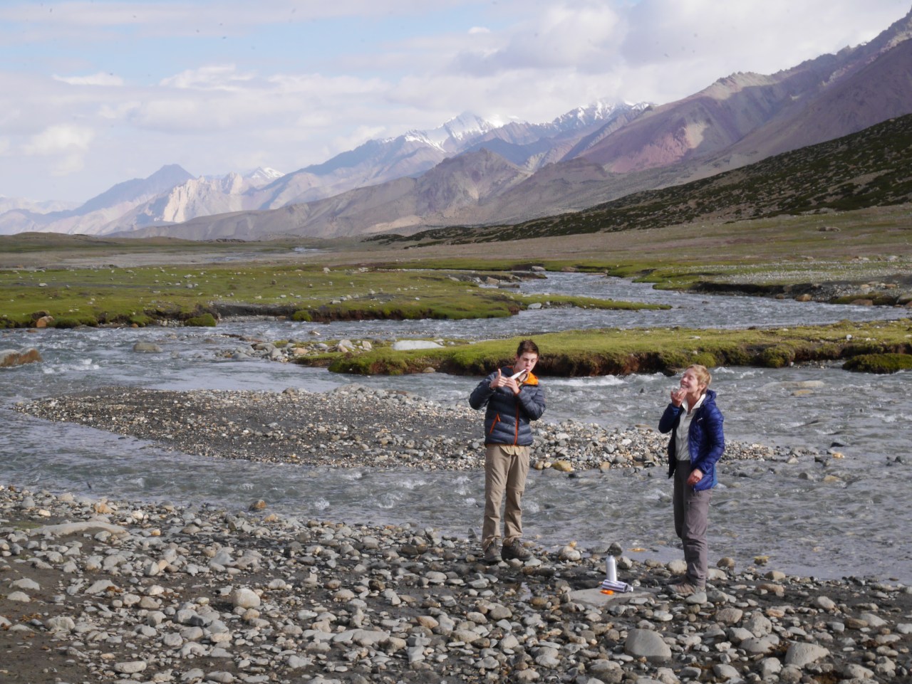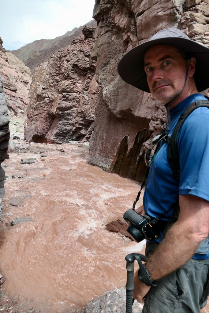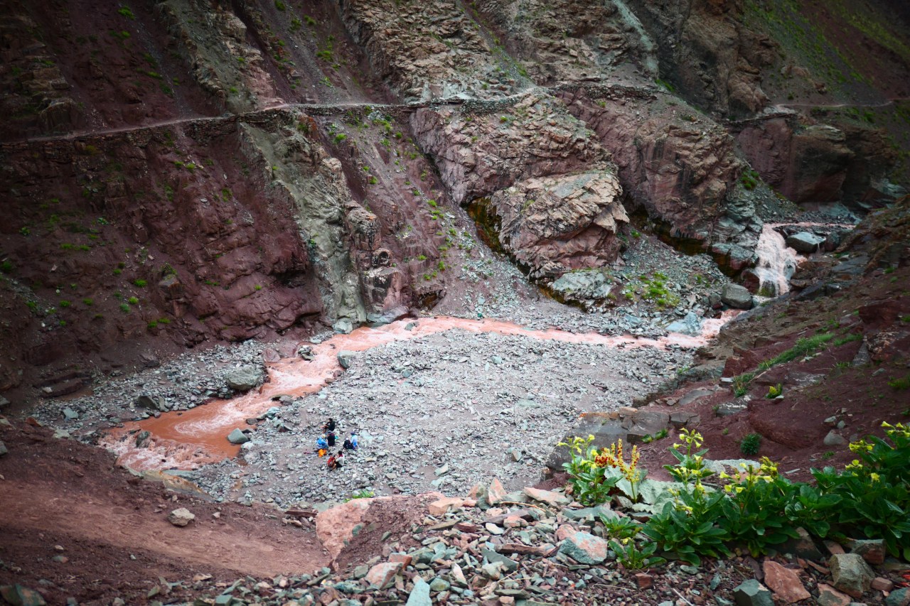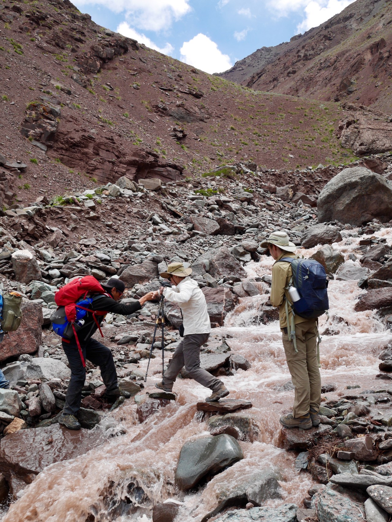 We pack up, purify some water from the river and set out across the bridge and onto the trail. It starts relatively steeply but after a good night’s sleep at 4800m we actually feel relatively well acclimatised. It seems easier today than yesterday. It’s cloudy and cool – which helps – and soon we are looking down on the bright cluster of tents, with snowy mountains rising behind them.