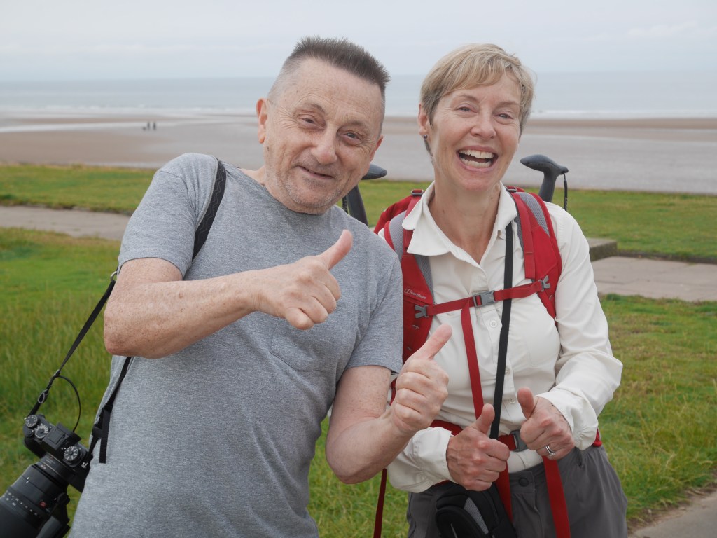 The start of the Coast to Coast is, um, at the coast. That was a half mile walk out of silent St Bees, brooding no doubt over the England football team’s traditional exit from a major competition on penalties. Across the railway tracks was a statue of St Bega – an Irish Princess from the Middle Ages who reportedly fled an arranged marriage and settled in the area which eventually took her name. Ten minutes later we were at the beachside signpost which marks the official start of the walk. We enlisted a passing Cliff to take our photo.